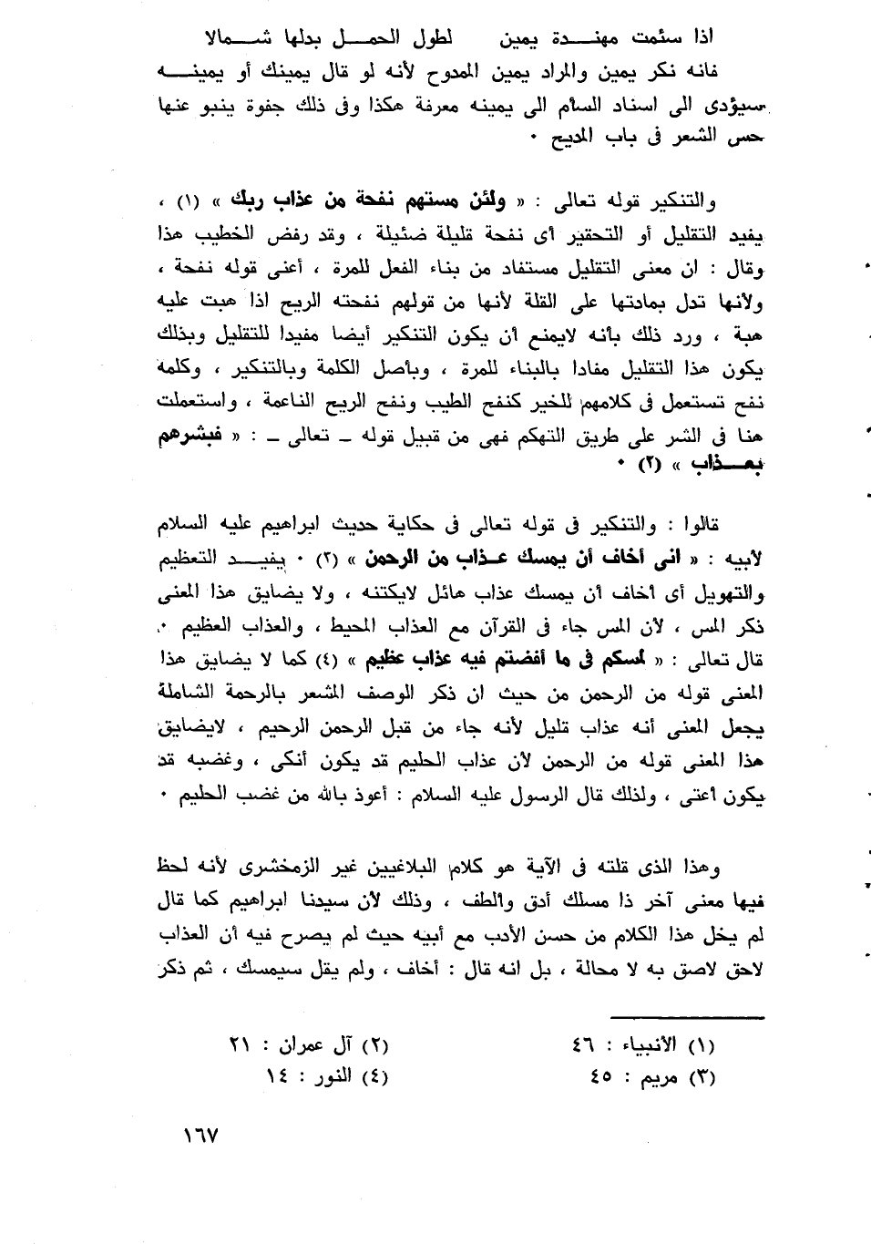 ألا يخطر بالبال؛ لأن وردوه في النفس يذهب بالمغزى منه، وإن كان يقرر وجوب تقديره، وعجيب أن يكون شرف النفس عند آبائي، وآبائك بهذه المنزلة حتى إنهم ليعتقدون أن دماء الكرام تشفى من الدونية، وأن القطرة من دمائهم ينقذ بها من سقط في وهدة الخسة والنذالة، وذكر عبد القاهر أيضا قول أسيد بن عنقاء الفزاري في عميلة الفزاري لما رآه عميلة، وقد نكبه دهره، واختلت حاله، فقال له: "يا عم؛ ما أصارك على ما أرى؟ "، فقال أسيد: "بخل مثلك بماله وصوان وجهي عن أموال الناس"، فقال: أما والله لئن بقيت إلى غد لأغيرن ما أرى من حالك، فما كان السحر سمع رغاء الإبل، وثغاء الشاة، وصهيل الخيل، ولجب الأموال، فقال: ما هذا: فقالوا: هذا عميلة ساق إليك أمواله؛ فلما خرج ابن عنقاء إليه قسم عميلة ماله شطرين، وساهم عمه عليه فقال أسيد: "من الطويل"