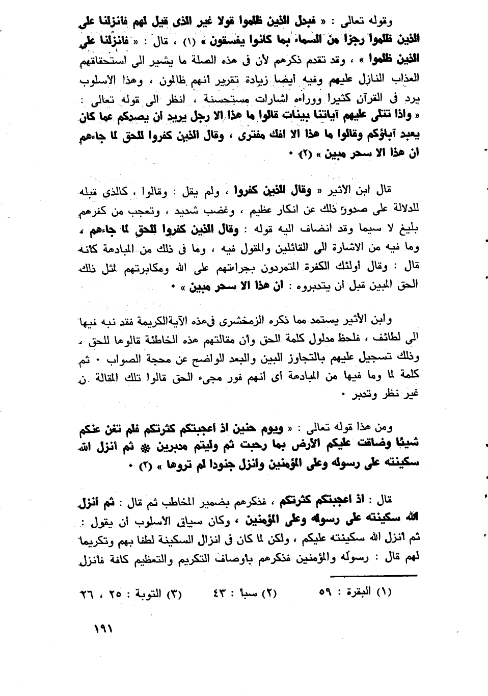 وَأَنَّ اللَّهَ هُوَ الْعَلِيُّ الْكَبِيرُ} 1، انظر إلى قوله تعالى: {وَأَنَّ اللَّهَ سَمِيعٌ بَصِيرٌ} ، وقوله: {وَأَنَّ اللَّهَ هُوَ الْعَلِيُّ الْكَبِيرُ} تجد المسند إليه قد ذكر مع أنه يمكن إقامة الضمير مقامه للغرض الذي قلناه، وهذا الأسلوب يكثر في فواصل الآيات كما يكثر في الجمل المستأنفة سواء كان استئنافها استئنافا بلاغيا كقولك: أحسنت إلى زيد، زيد حقيق بالإحسان، وقوله تعالى: {يَا أَيُّهَا النَّبِيُّ اتَّقِ اللَّهَ وَلَا تُطِعِ الْكَافِرِينَ وَالْمُنَافِقِينَ إِنَّ اللَّهَ كَانَ عَلِيمًا حَكِيمًا، وَاتَّبِعْ مَا يُوحَى إِلَيْكَ مِنْ رَبِّكَ إِنَّ اللَّهَ كَانَ بِمَا تَعْمَلُونَ خَبِيرًا} 2، أو كان استئنافا نحويا أي بواو الاستئناف مثل: {وَتَوَكَّلْ عَلَى اللَّهِ وَكَفَى بِاللَّهِ وَكِيلًا} 3، وهذه الجمل كما ترى من الممكن أن تقتطع من سياقها، وأن تستقل بإفادة معناها، ولذلك يشيع بعضها شيوع الأمثال، والذي أتاح ذلك هو ذكر المسند إليه، ولو كان المذكور هو الضمير لارتبط بالكلام السابق؛ لأن فيه مرجعه، وهذا الأسلوب يشيع في القرآن جدا كما يوجد في الشعر وغيره، وقد نبه إلى هذا المغزى المفسرون، وفي كتب التفسير من المباحث البلاغية ما لا يوجد في كتب البلاغيين.