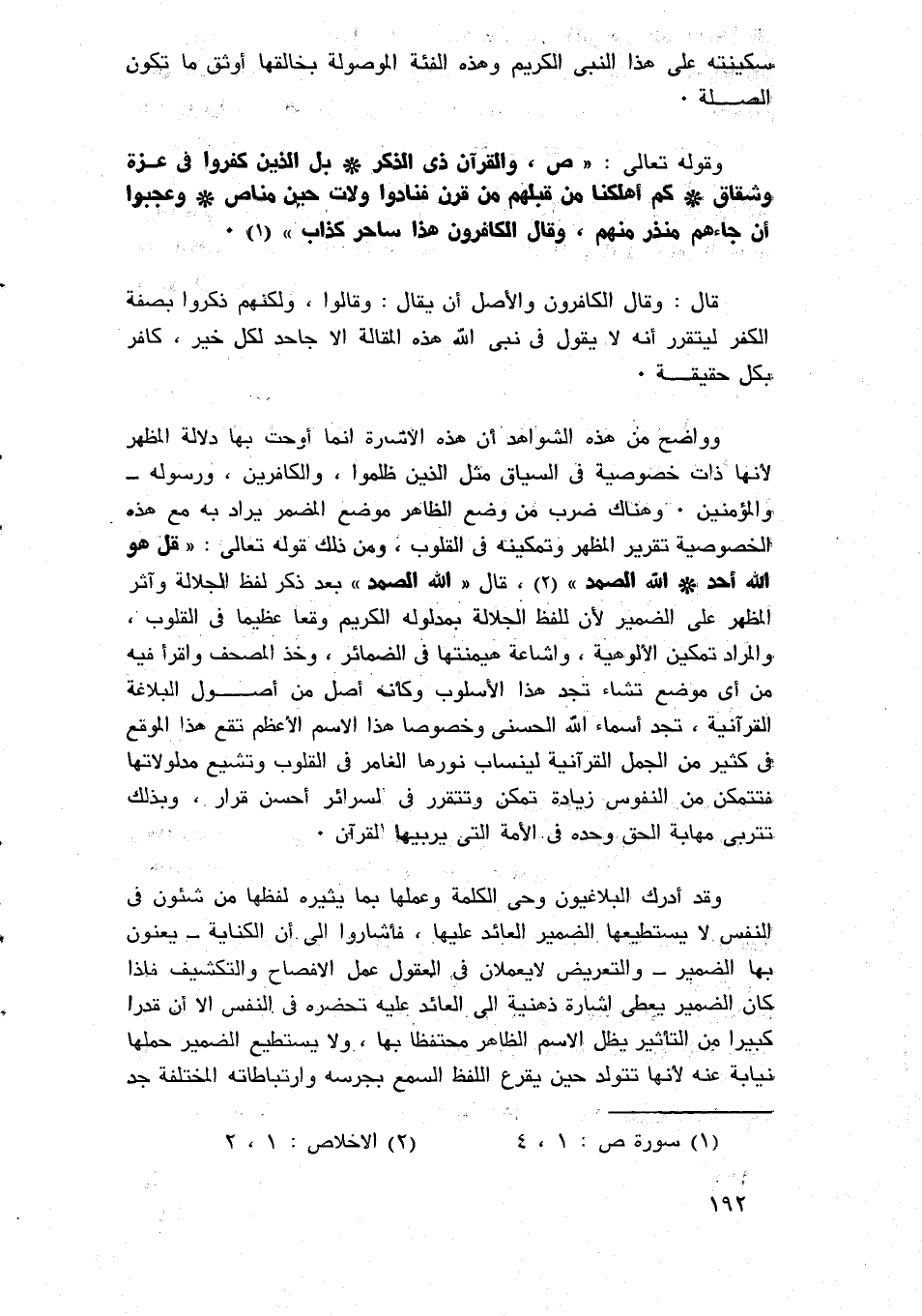 حين عرض البلاغيون لبيان الأسرار البلاغية، في طرق التعريف سلك كثير من المباحث النحوية طريقة إلى هذا الباب، ونحاول في هذه الدراسة أن نتجنب هذه المباحث مهتمين بما يتصل بالناحية البلاغية، التي يمكن أن يلحظها دارس الأساليب، وكنا على أن ندع من بين ذلك ما ذكره البلاغيون في التعريف بالإضمار لولا ما كان منهم من لفتة طيبة ذات أثر في تعميق فهمنا لبلاغة الكلام أحببنا أن ننبه إليها.