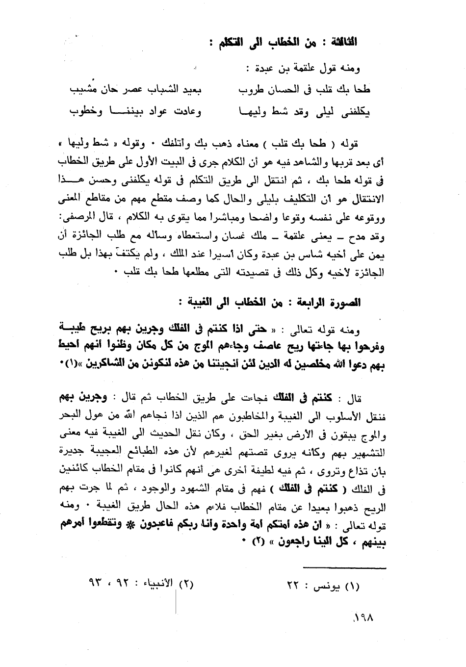الدليل، وتعجبني هنا لفتة الخطيب، ويبدو أنه كان أرق نفسا، وأسلس طبعا من السكاكي، قال الخطيب: والمسند إليه في البيت ليس فيه إيماء إلى وجه بناء الخبر عليه، بل لا يبعد أن يكون فيه إيماء إلى بناء نقيضه عليه، وقد أدرك الخطيب في هذا معنى دقيقا في الغزل هو أن الحرمان من الصاحبة أزكى لجذوة الحب إن كات صادقة، وهذا ما عليه أهل الرأي في الحس والشعور، وقد عبر عنه الشعراء من ذوي الطبع الصادق، قال ابن الدمينة: "من الطويل"