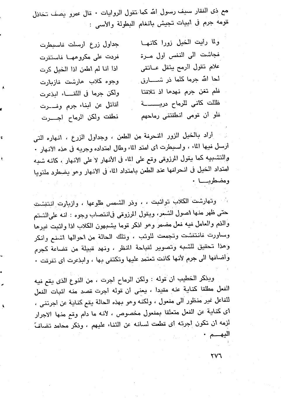 ومثل هذا قوله تعالى: {أَفَمَنْ شَرَحَ اللَّهُ صَدْرَهُ لِلْإِسْلَامِ فَهُوَ عَلَى نُورٍ مِنْ رَبِّهِ فَوَيْلٌ لِلْقَاسِيَةِ قُلُوبُهُمْ} 2، أي: أهذا خير أم من جعل صدره ضيقا حرجًا، فحذف الثاني ليفيد الحذف إهماله، وانظر قوله: {فَهُوَ عَلَى نُورٍ مِنْ رَبِّهِ} ، فإنها كلمة لا تجد لحسنها نهاية، وصاحبها لا يمشي على طريق منير فحسب، وإنما يمشي على نور، وهو نور يملأ القلب، ويتوهج في الضمير؛ لأنه نور من ربه، ولعل في الحذف هنا سرا آخر هو الرغبة في أن ينصرف الذهن إلى هذه الصورة ليمتلئ القلب بها، ولتبقى وحدها في التعبير لا تنازعها أخرى، ومثلها قوله تعالى: {أَمْ مَنْ هُوَ قَانِتٌ آنَاءَ اللَّيْلِ سَاجِدًا وَقَائِمًا يَحْذَرُ الْآخِرَةَ وَيَرْجُو رَحْمَةَ رَبِّهِ} 3، أي كمن ليس كذلك.