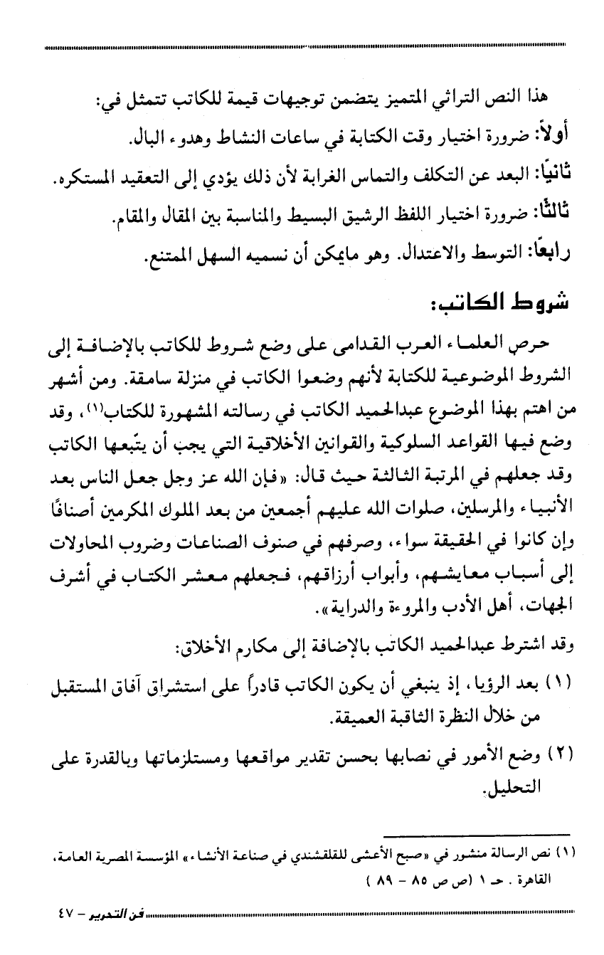 حرص العلماء العرب القدامى على وضع شروط للكاتب بالإضافة إلى الشروط الموضوعية للكتابة؛ لأنهم وضعوا الكاتب في منزلة سامقة. ومن أشهر من اهتم بهذا الموضوع عبد الحميد الكاتب في رسالته المشهورة للكتاب1، وقد وضع فيها القواعد السلوكية والقوانين الأخلاقية التي يجب أن يتبعها الكاتب وقد جعلهم في المرتبة الثالثة حيث قال: فإن الله عز وجل جعل الناس بعد الأنبياء والمرسلين، صلوات الله عليهم أجمعين من بعد الملوك المكرمين أصنافًا وإن كانوا في الحقيقة سواء، وصرفهم في صنوف الصناعات وضروب المحاولات إلى أسباب معايشهم، وأبواب أرزاقهم، فجعلهم معشر الكتاب في أشرف الجهات، أهل الأدب والمروءة والدراية.