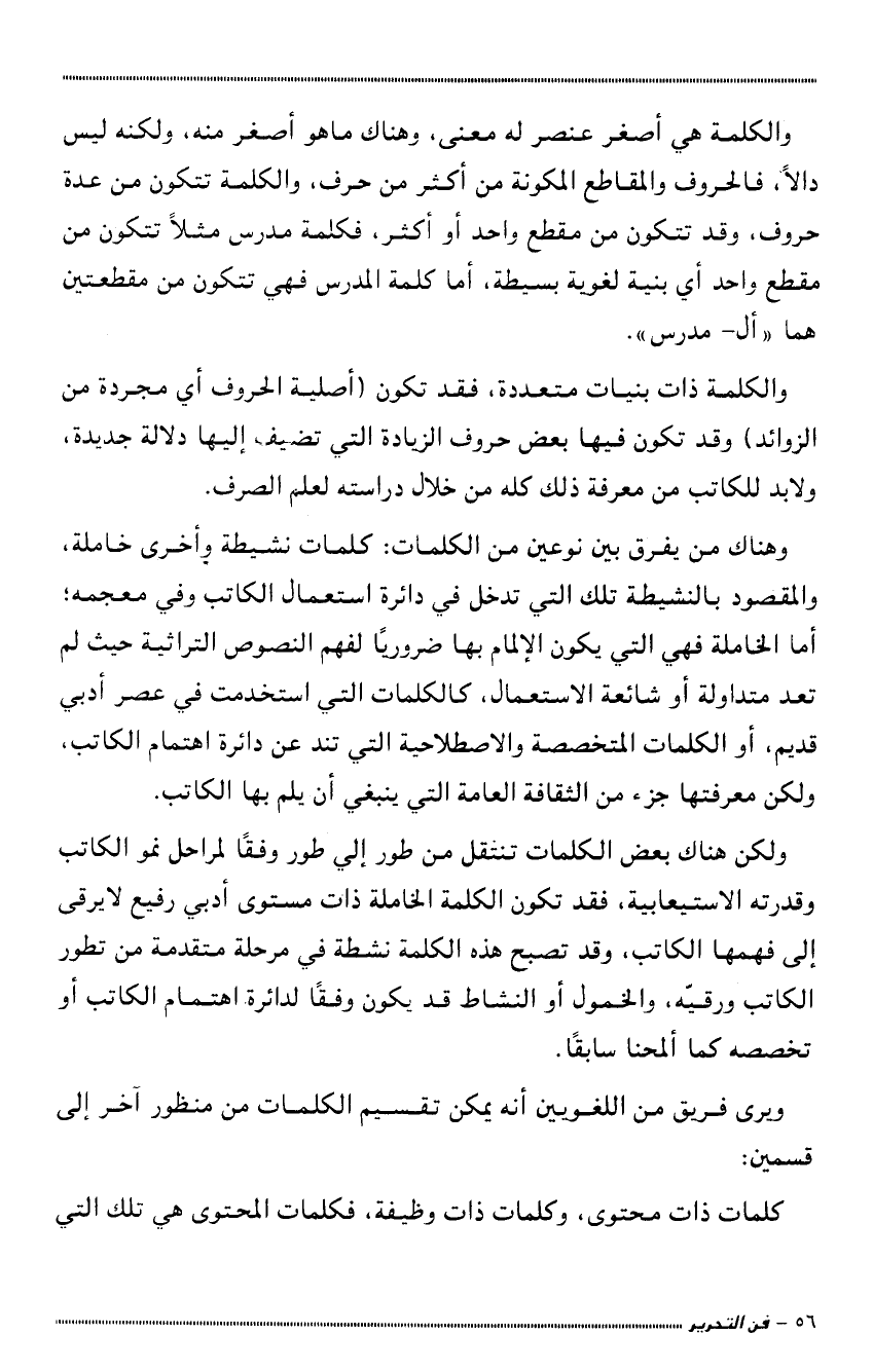 والكلمة ذات بنيات متعددة، فقد تكون أصلية الحروف أي مجردة من الزوائد، وقد تكون فيها بعض حروف الزيادة التي تضيف إليها دلالة جدية، ولابد للكاتب من معرفة ذلك كله من خلال دراسته لعلم الصرف.