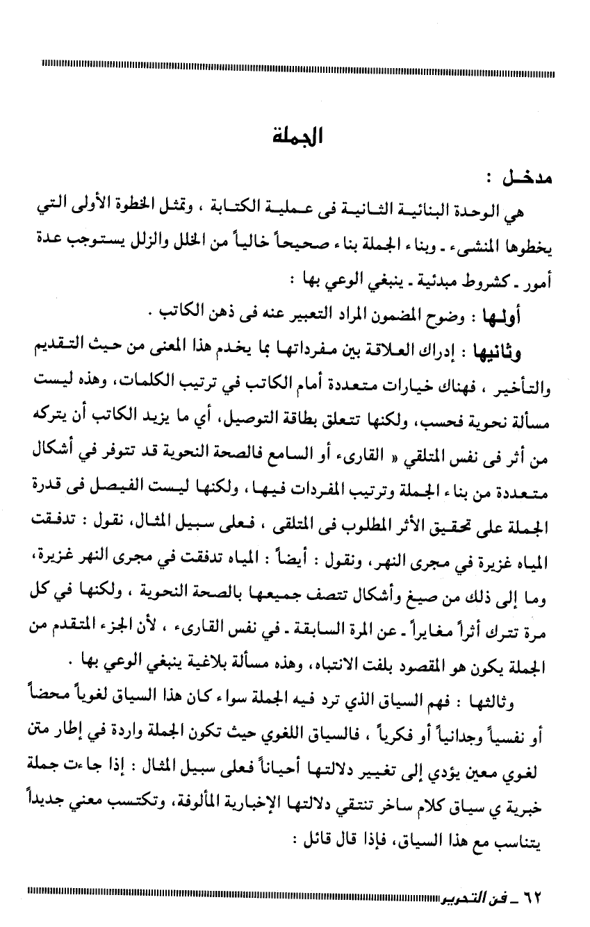 وثانيها: إدراك العلاقة بين مفرداتها بما يخدم هذا المعنى من حيث التقديم والتأخير، فهناك خيارات متعددة أمام الكاتب في ترتيب الكلمات، وهذه ليست مسألة نحوية فحسب، ولكنها تتعلق بطاقة التوصيل، أي ما يريد الكاتب أن يتركه من أثر في نفس المتلقي "القارئ أو السامع فالصحة النحوية قد تتوفر في أشكال متعددة من بناء الجملة وترتيب المفردات فيها، ولكنها ليست الفيصل في قدرة الجملة على تحقيق الأثر المطلوب في المتلقي، فعلى سبيل المثال، نقول: تدفقت المياه غزيرة في مجرى النهر، ونقول: أيضًا: المياه تدفقت في مجرى النهر غزيرة، وما إلى ذلك من صيغ وأشكال تتصف جميعها بالصحة النحوية، ولكنها في كل مرة تترك أثرًا مغايرًا -عن المرة السابقة- في نفس القارئ، لأن الجزء المتقدم من الجملة يكون هو المقصود بلفت الانتباه، وهذه مسألة بلاغية ينبغي الوعي بها.