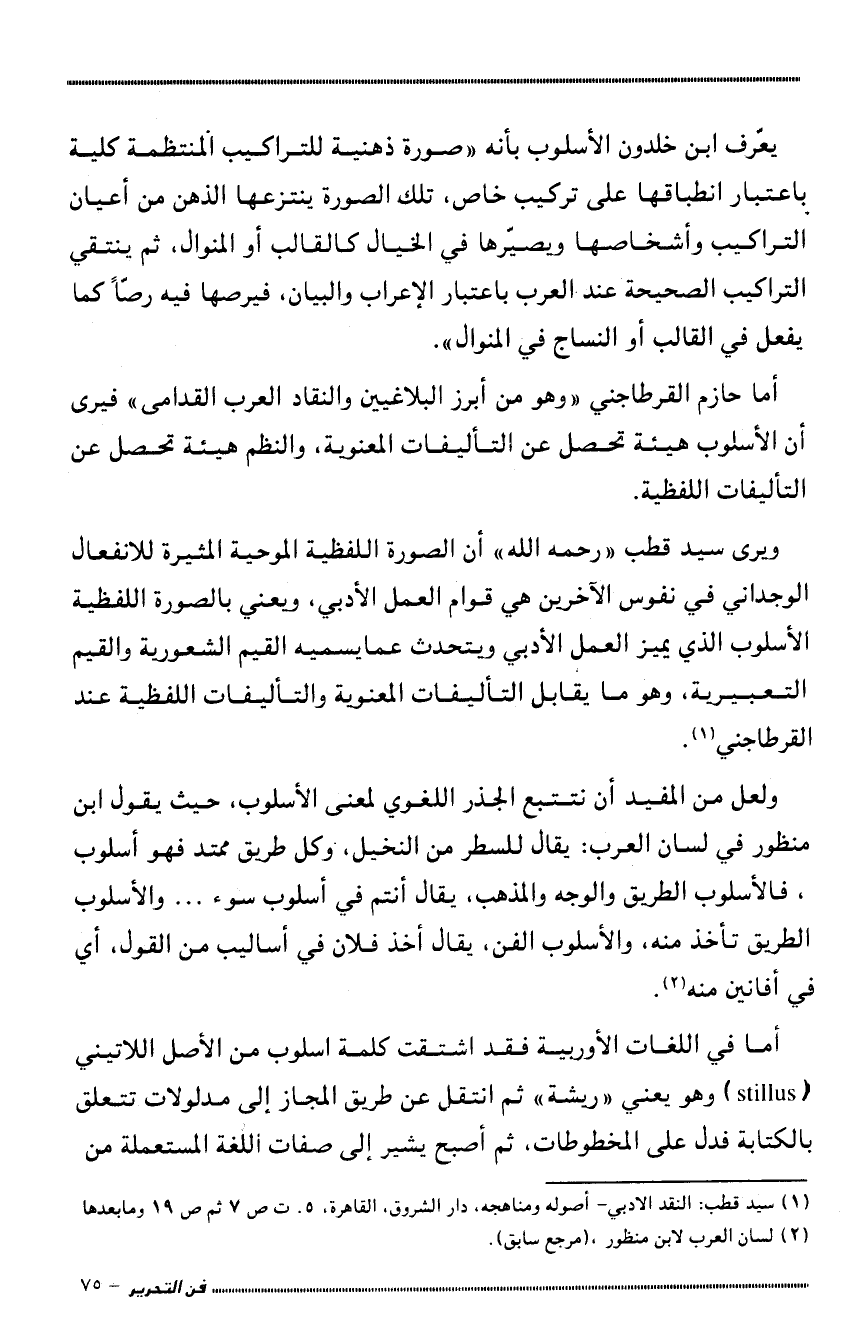 ولعل من المفيد أن نتتبع الجذر اللغوي لمعنى الأسلوب، حيث يقول ابن منظور في "لسان العرب": يقال للسطر من التخيل، وكل طريق ممتد فهو أسلوب، فالأسلوب الطريق والوجه والمذهب، يقال أنتم في أسلوب سوء ... والأسلوب الطريق تأخذ منه، والأسلوب الفنن يقال أخذ فلان في أساليب من القول، أي في أفانين منه2.