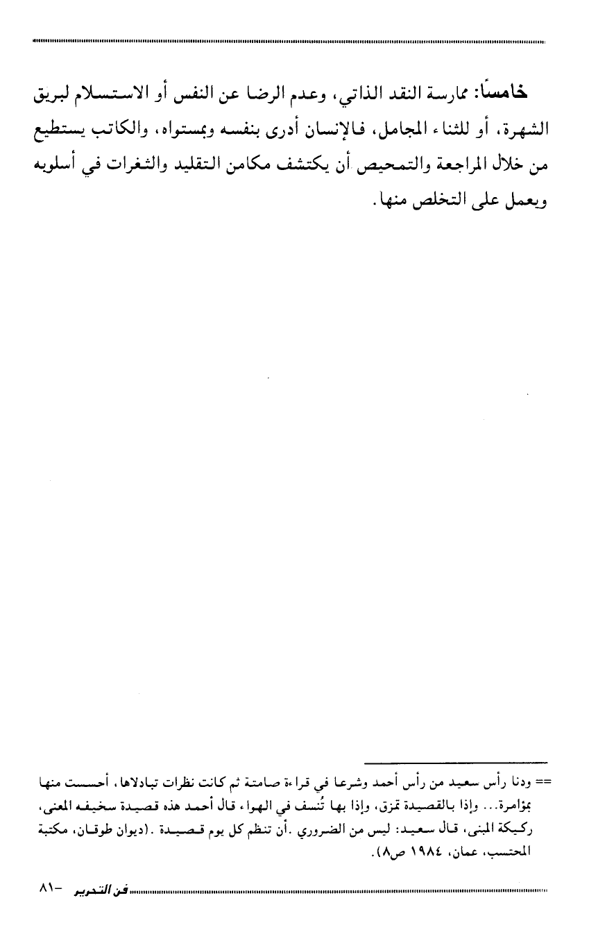 خامسًا: ممارسة النقد الذاتي، وعدم الرضا عن النفس أو الاستسلام لبريق الشهرة، أو للثناء المجامل، فالإنسان أدرى بنفسه وبمستواه، والكاتب يستطيع من خلال المراجعة والتمحيص أن يكتشف مكامن التقليد والثغرات في أسلوبه ويعمل على التخلص منها.