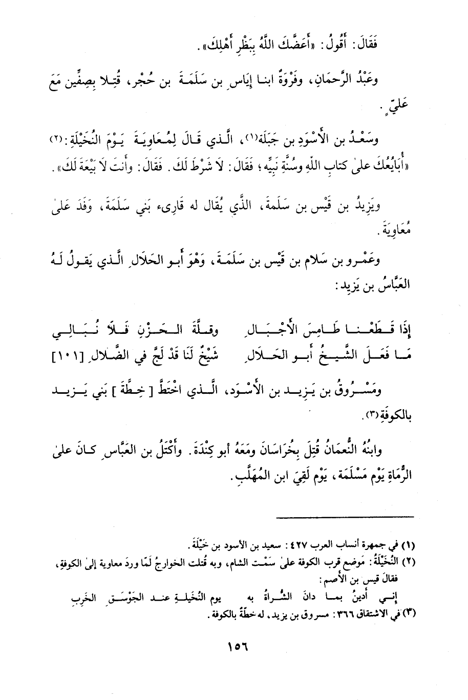 فقال: أقولُ: أَعَضَّك اللَّهُ بِبظْرِ أَهْلِك وعَبْد الرَّحمان، وفَرْوة أنبا إياس بن سَلَمة بن حُجْر، قتلا بصفين مع عَليّ.