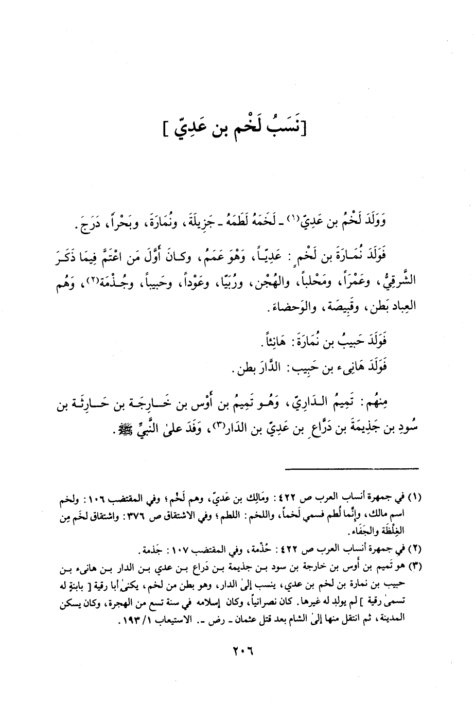 فولد نُمَارَةَ بن لَخْمٍ: عَدِيّاً، وهو عَمَمُ، وكان أول من اعتم فيما ذكر الشرق، وعَمْراً، ومَحْلباً، والهُجْن، وربَيّا، وعَوْداً، وحَبيباً، وجُذْمَة، وهم العِباد بطن، وقَبِيصًة، والوَحضاءَ فولد حَبيبُ بن نُمَارَةَ: هَبِئاً.