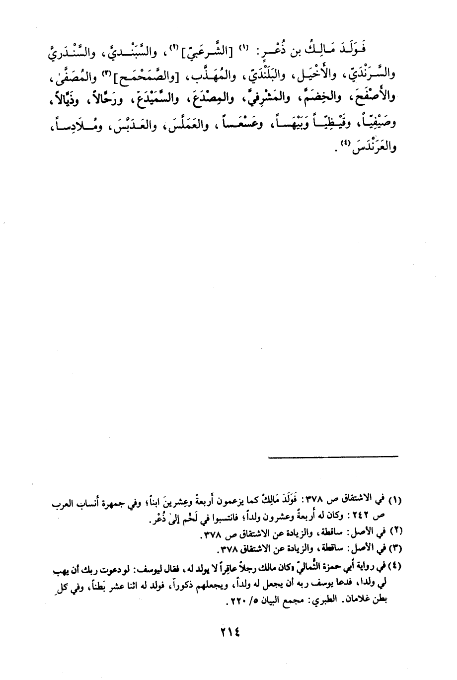 فَوَلَدَ مَالِك بن ذُعْر: " الشرعبي "، والسَّبَنْديَّ، والسَّنَْدَرسَّ، والسَّرَنْديّ، والأخَيْل، والبَلَندَيّ، والمُهَذَّب، " والصَّمَحمَح " والمُصفَّى، والأصفْحَ، والخضمَّ، والمَشْرِفيَّ، والمِصْدَعَ، والسَّمَيْدعَ، ورَحَّالاً، وذَيَّالاً، وصَيفْياً، وقَيْظّياً وَبَيْهَساً، وعَسْعَساً، والعَمَلَّسَ، ومُلاَدِساً، والعَرَنْدَسَ.
