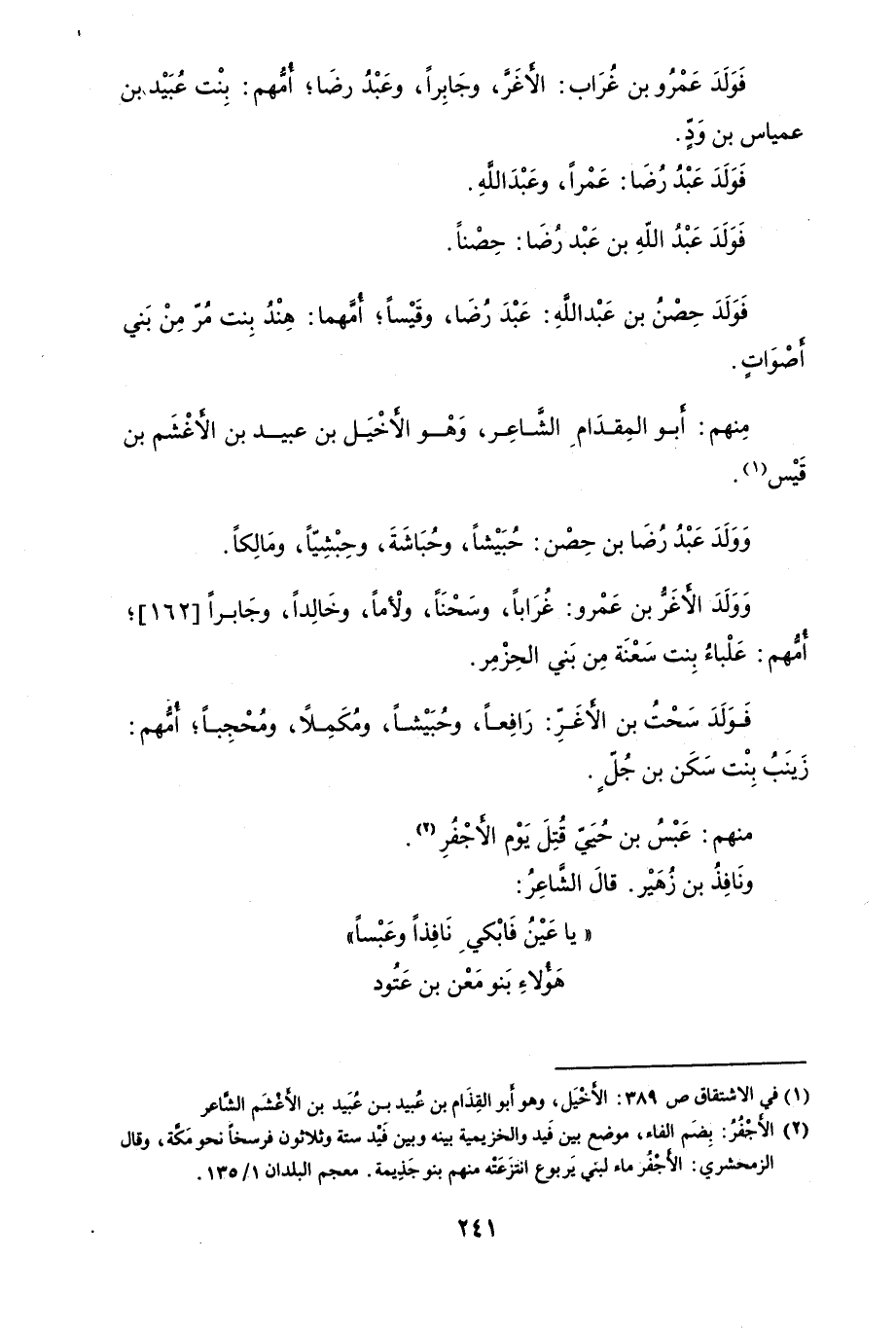 فَوَلَدَ حِصْن بن عَبْدِالله: عَبْدِ الرُضَا، وقَيْساً أُمُّهُما: هِنْدُ بِنْت مُرّ من بَني أَصْوَات منهم: ابو المِقدَامِ الشَّاعِر، وهو الاخَيْل بن عُبَيْد بن الأَغْشَم بن قَيْس ووَلَدَ عَبْدِالله بن حِصْن: حُبَيْشاً وحُبَاشَةَ، جِبْشيّاً، مَالِكاً ووَلَدَ الأَغَرَّ بن عُمُرّو: غُرَاباً، سَحْنَاً، لأْماً، وخَالِداً امهم ك عَلْباءُ بِنْت سُعْنَة مِن بَني الحِزمُرّ فَوَلَدَ سَحْتُ بن الأَغَرَّ ك رَافِعاً، حُبَيْشاً، وُمَكِملاً، وحُجْبِاً امهم زَينَبُ بِنْت سَكْنُ بن جُلُّ