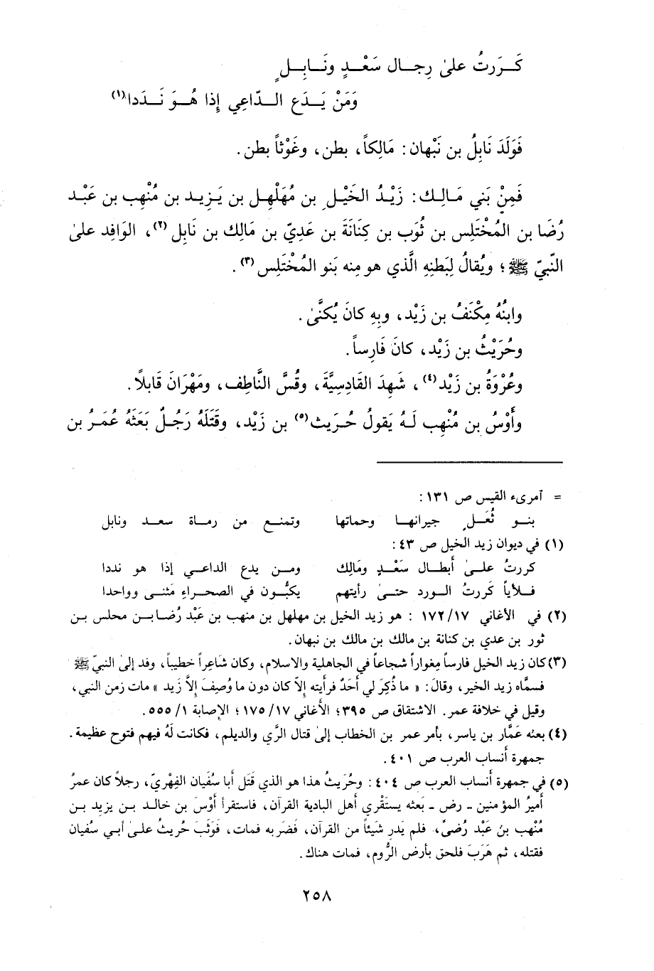 فَمِنْ بَني مَالِك: زَيْد الخَيْلِ بن مُهَلَهُل بن يَزَيْد بن منِهب بن عَبْدَ رُضَا بن المخْتَلِس بن ثُوَب بن كِنَانةَ بن عَدِيّ بن مَالِك بن نَابِلُ، الوَافِد عَلَى النّبيّ صلى الله عليه وسلمويُقالُ لِبَطنهِ الَّذي هو منِه بَنو المخْتَلِس.