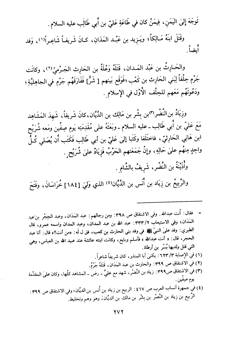 وزِيَاد بن النَّضْر بن بِشْرَُ بن مَالِك بن الدَّيَّان، كان شَرِيفُاً، شَهِدَ المشاهد مع عَليّ بن أبي طَالِب - عَليّه السلام - وبَعَثهُ عَلَى مقدمته يَوْمَ صَيْفيُّن ومَعَهُ شُرَيْح أبن هَاني الحَارِثَي، فاختَلَفا وكَتَبا إلى عَليّ بن أبي طَالِب فَكَتَبَ ان يُصَلي كل واحِدٍ منِهم عَلَى حَالَهُ، وان جَمَعَتهم الحَرْب فزِيَاد عَلَى شُرَيْح.