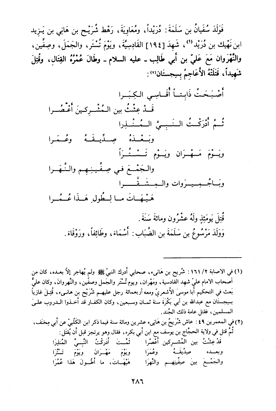 فَوَلَدَسُفَيانَ بن سَلَمَةُ: دُرَيْداً، ومُعَاوِيَةَ، رَهْطُ شُرَيْح بن هاَنِي بن يَزَيْد ابن نَهْيك بن دُرَيْد، شَهِدَ القَادِسيَّةَ، ويَوْمَ تُسْتَر، والجَمَلُ، وَصِيفيُّن، والنهروان مع عَليّ بن ابي طَالِب - وطَالَ عمُرّه القِتَال، وقَتَلَ شَهِيداً، قَتَلَته الأَعَاجِمُ بِسِجستاَن: