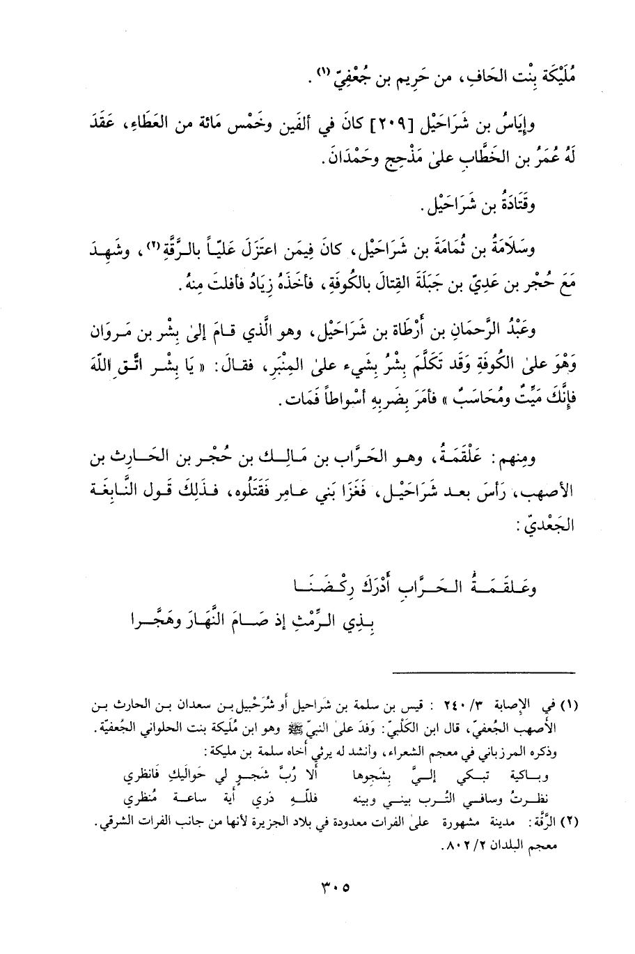 وعَبْدَ الرَّحمَان بن أَرْطَاة بن شَرَاحَيْل، وهو الَّذي قام إلى بِشْر بن مُروَان وَهْوَ على الكُوفَةِ وقد تَكَلَّمَ بِشْرَُ بِشَئ عَلَى المنبر، فَقَأل: " يا بِشْر اتَّقِ اللَهُ فاِنَّكَ مَيَّتٌ ومُحَاسَبٌ " فأمَرَ بِضَرِبِه أسْواطاً فَمَاتَ.