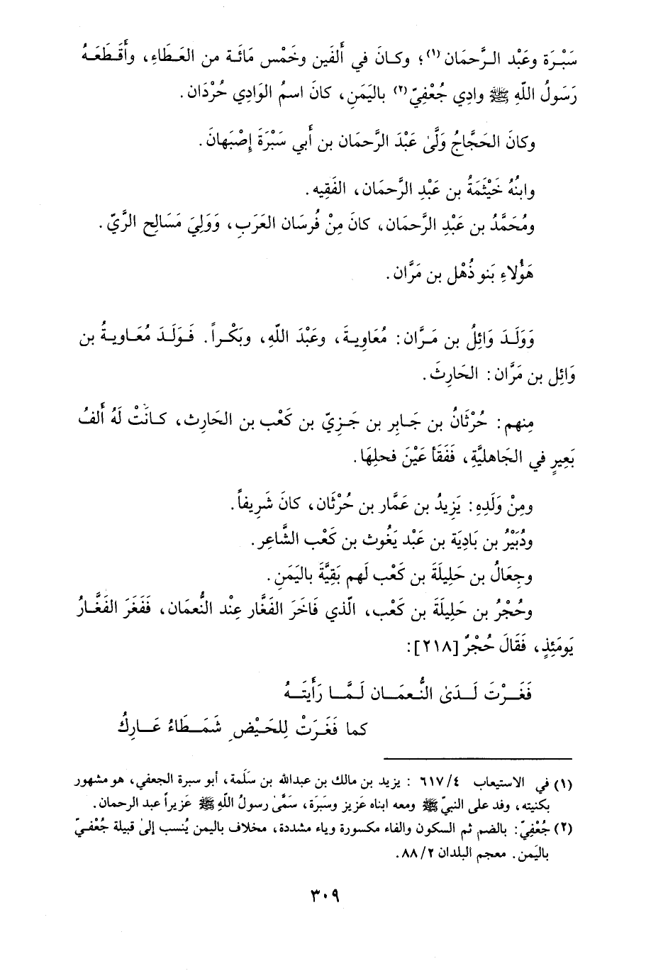 سَبْرَةَ وعَبْدَ الرَّحمَان؛ وكان َفي أَلفَين وخَمْس مَائَة من العَطَاءِ، وأَقَطَعَهُ رَسَولُ اللَهُ صلى الله عليه وسلموادِي جُعْفيّ باليَمَنِ، وكانَ اسمُ الوَادِي حُرْدَان.