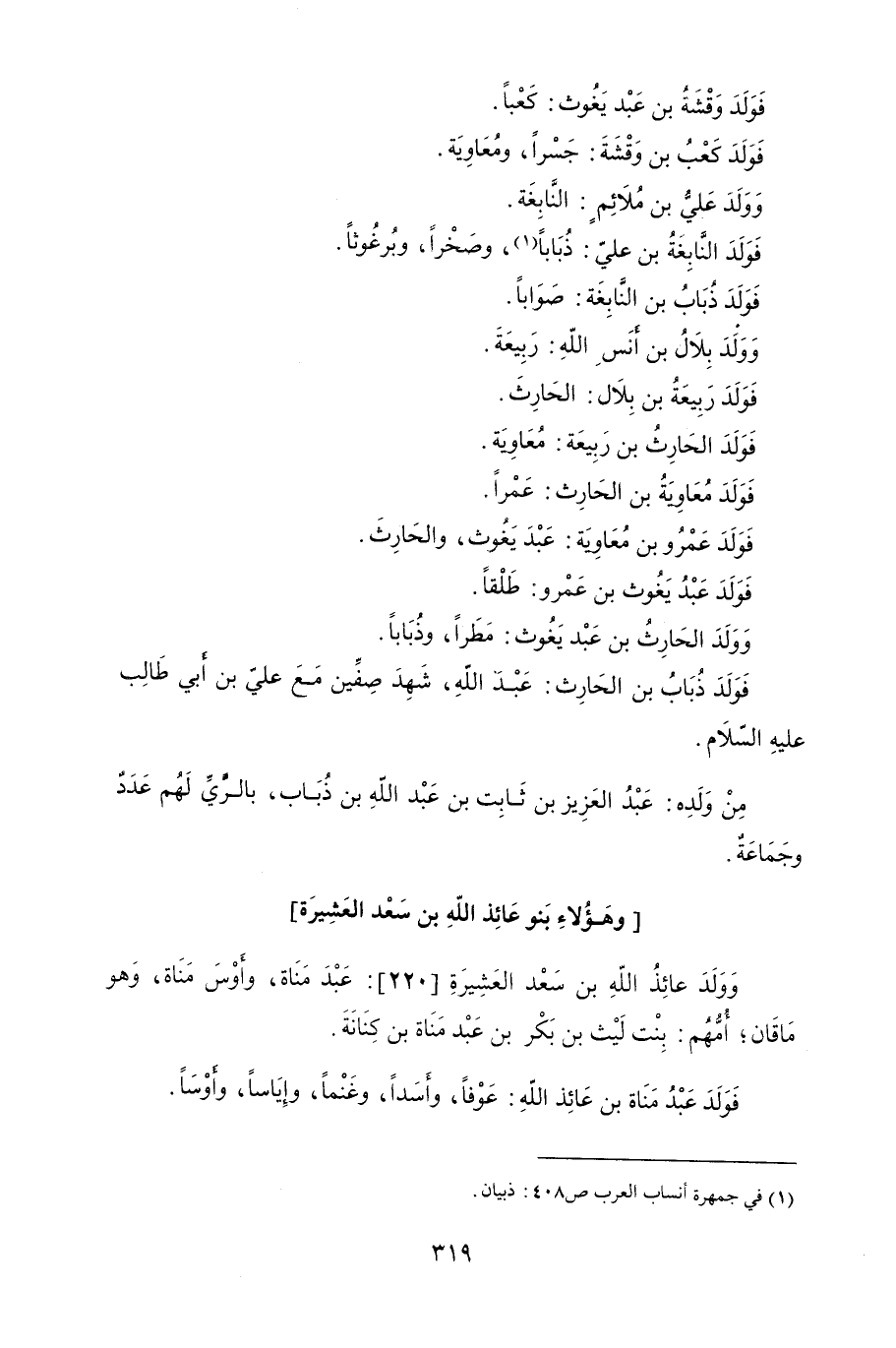 فَوَلَدَ عَبْدَ مَنَاةُ بن عَائِذَ اللَهُ: عَوْفاً، وأَسَدِاً، وغَنْمُاً، وإِيَّاسِاً، وأَوْساً.