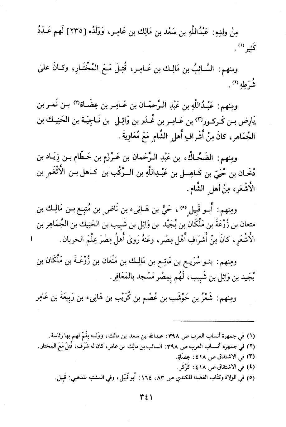 ومنِهم: ابو قَبِيلٍ حَيُّ بن هَانئ بن نَاضِ بن مُتبِع بن مَالِك بن متعان بن زُرْعَةَ بن مَلِكان بن بُجَيْد بن وَائِل بن شَبِيب بن الحَنِيك بن الجُمَاهِر بن الأَشْعَر، كانَ مِنْ أَشرَاف أَهْل مِصْر، وعَنهُ رَوى أَهلُ مِصْر عِلْمَ الحربان.