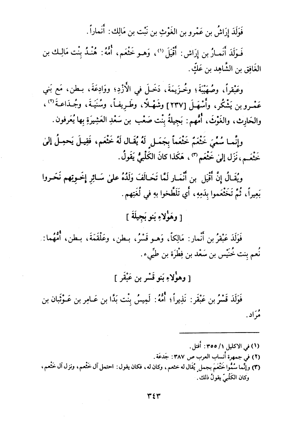فَوَلَدَ أَنْمار بن إِرَاشُ: اقْيَلَ، وَهو خَثْعَم، أُمَّهُ: هِنْدُ بِنْت مَالِك بن الغَافِق بن الشّاهد بن عَكٍ.
