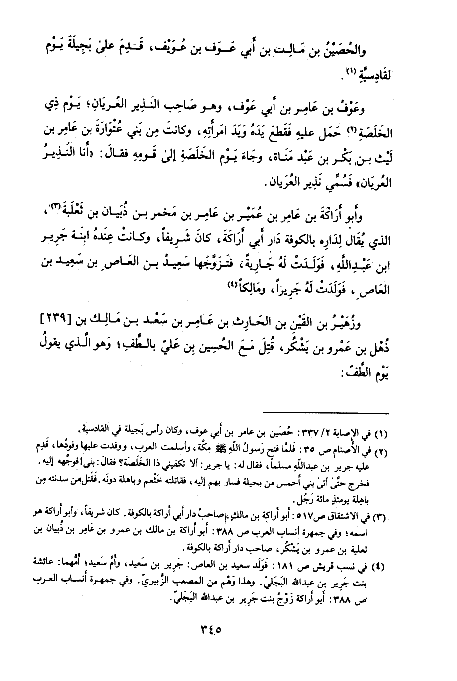 وعَوْف بن عَامِر بن ابي عَوْف، وهو صَاحِب النَذِي العُريَانِ؛ يَوْمَ ذِي الخَلَصَةَ حَمل عَليّه فَقَطع يَدَهُ وَيَدَ امُرّأته، وكانتَ مِن بَني عُتْوَارَةَ بن عَامِر بن لَيْث بن بَكر بن عَبْدَ مَنَاةُ، وجاء يَوْمَ الخَلَصَةِ إلى قَوْمِهِ فَقَأل: " أَنا النَذِير العُريَان " فسُمَّي نَذِير العُرَيان.