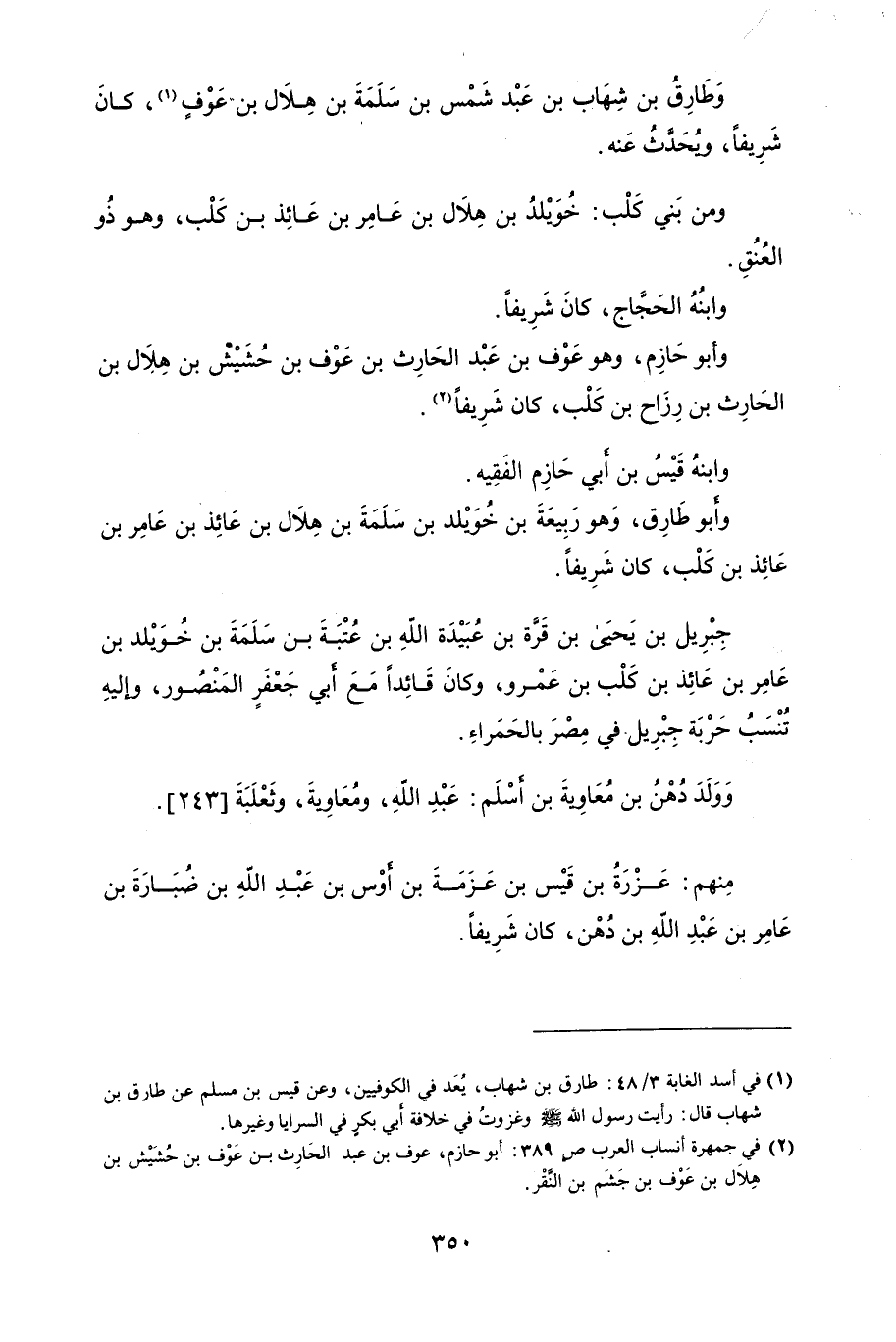 وَطَارِقُ بن شِهَاب بن عَبْدَ شَمْس بن سَلَمَةُ بن هِلاَل بن عَوْف، كانَ شَرِيفاً ويُحَدَّثُ عَنه ومن بَني كَلْب: خُوَيْلدُ بن هِلاَل بن عَامِر بن عَائِذ بن كَلْب، وهو ذُو العُنُقِ.