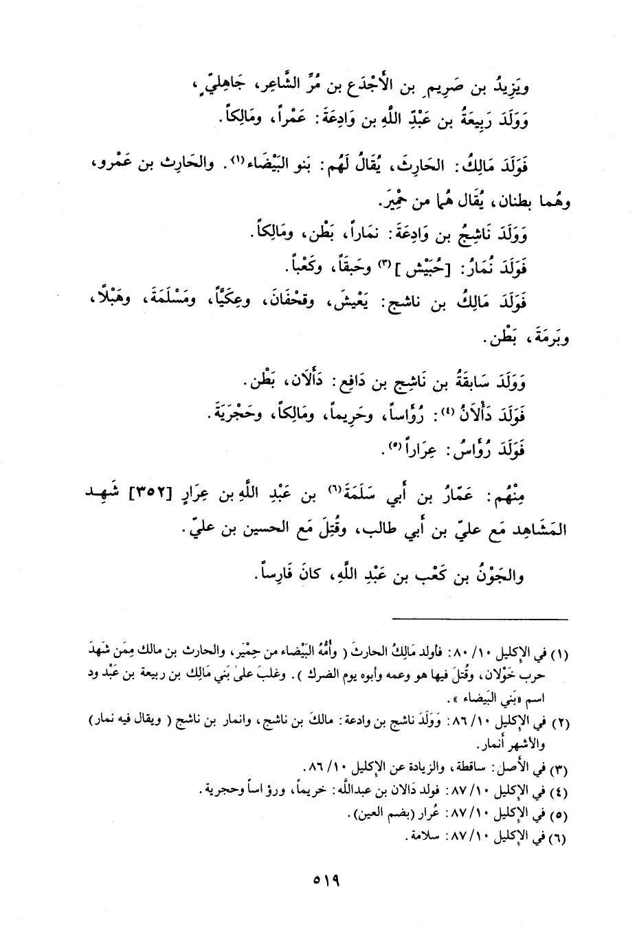 فولد مالك: الحارث، يقالُ لهم: بنو البيضاء. والحارث بن عمرو، وهما بطنان، يقال هما من حمير.