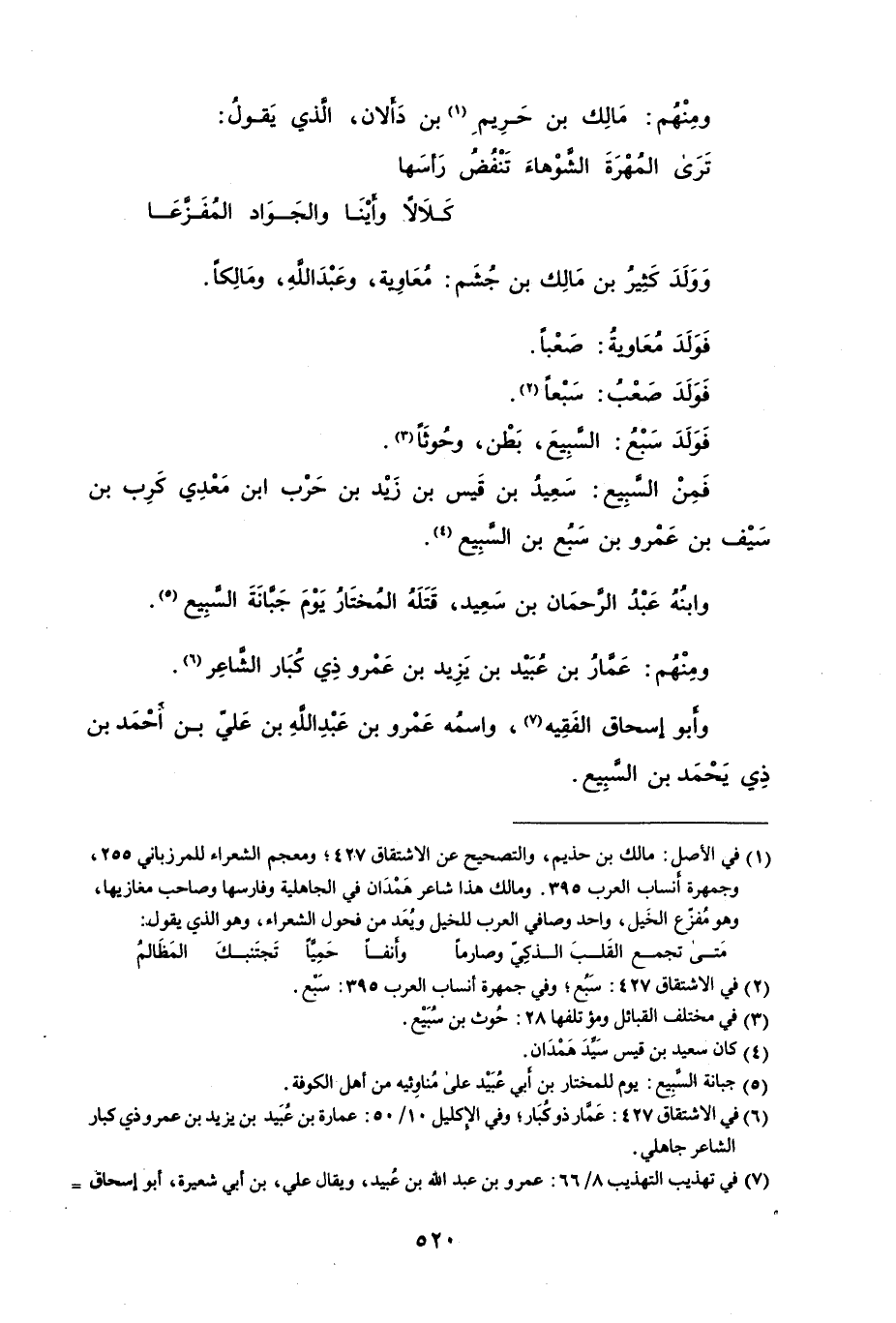 فمن السبيع: سعيد بن قيس بن زيد بن حرب ابن معدي كرب بن سيف بن عمرو بن سبع بن السبيع.