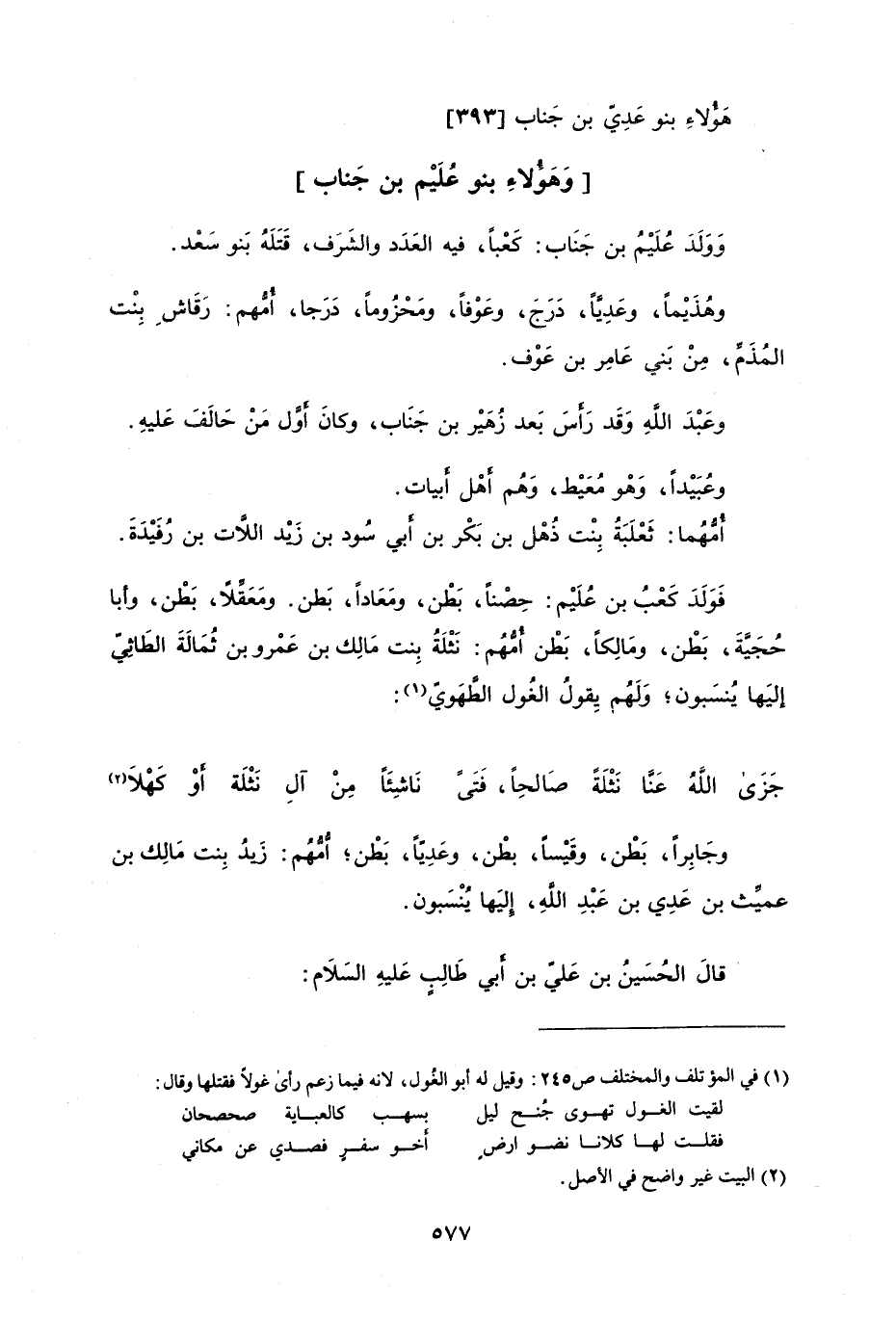 وولدَ عُليمُ بن جناب: كعباً، فيهِ العدد والشرف، قتلهُ بنو سعد.
