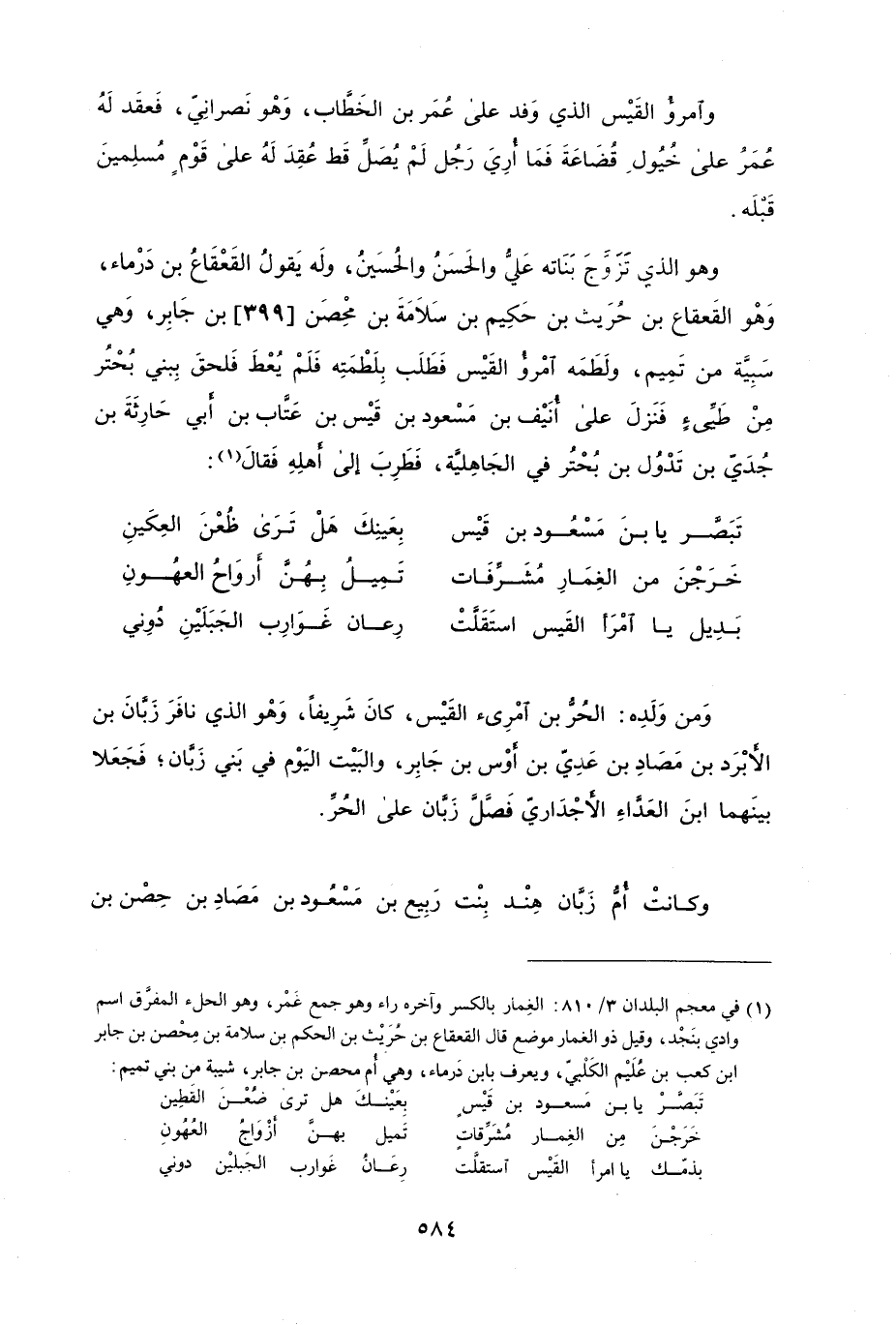 وهو الذي تزوَّجَ بناته عليُّ والحسنُ والحُسينُ، وله يقولُ القعقاعُ بن درماء، وهو القعقاع بن حُريث بن حكيم بن سلامة بن محصن بن جابر، وهي سبيَّة من تميم، ولطمه امرؤُ القيس فطلب بلطمته فلم يعط فلحقَ ببني بُحترُ من طيَّىءٍ فنزلَ على أُنيف بن مسعود بن قيس بن عَتَّاب بن أَبي حارثةَ بن جُديّ بن تدوُل بن بُحتر في الجاهلية، فطرب إلى أَهله فقال: