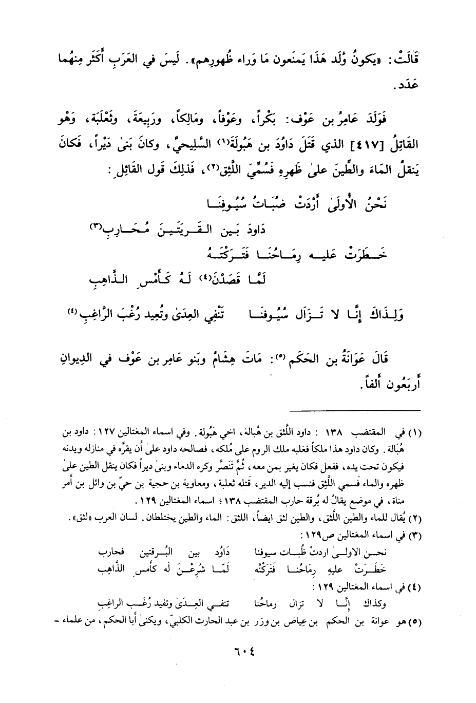 فولد عامر بن عوف: بكراً، وعوفاً، ومالكاً، وربيعةَ، وثعلبةَ، وهو القاتلُ الذي قتل داودَ بن هبولة السَّليحيَّ، وكان بني ديراً، فكان ينقلُ الماء والطين على ظهرهِ فسُمِّيَ اللَّثق، فذلك قول القائلِ: