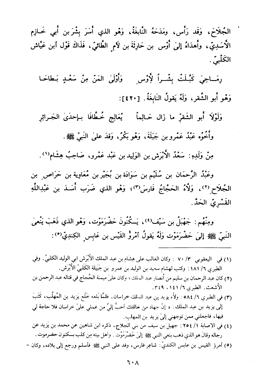 الجُلاحَ، وقد رأس، ومدحهُ النَّابغةُ، وهو الذي أَسر بشر بن أَبي خازِم الأَسديّ، وأَهداهُ إلى أَوس بن حارثة بن لأمٍ الطَّائيّ، فذاك قول ابن عيَّاش الكلبيّ.