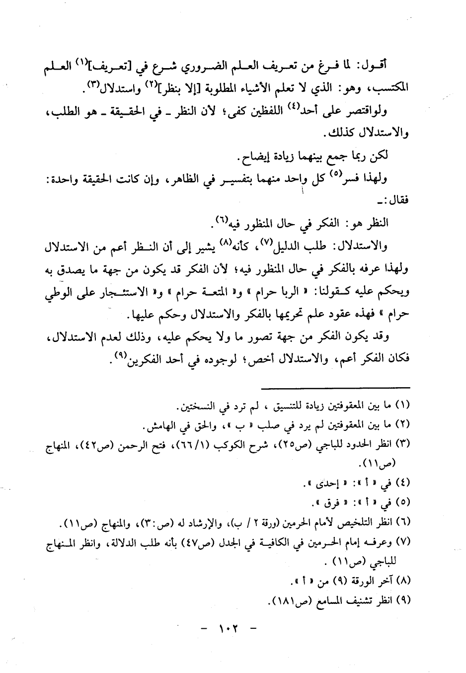أَقُول: لما فرغ من تَعْرِيف الْعلم الضَّرُورِيّ شرع فِي [تَعْرِيف] الْعلم المكتسب، وَهُوَ: الَّذِي لَا تعلم الْأَشْيَاء الْمَطْلُوبَة [إِلَّا بِنَظَر] واستدلال.