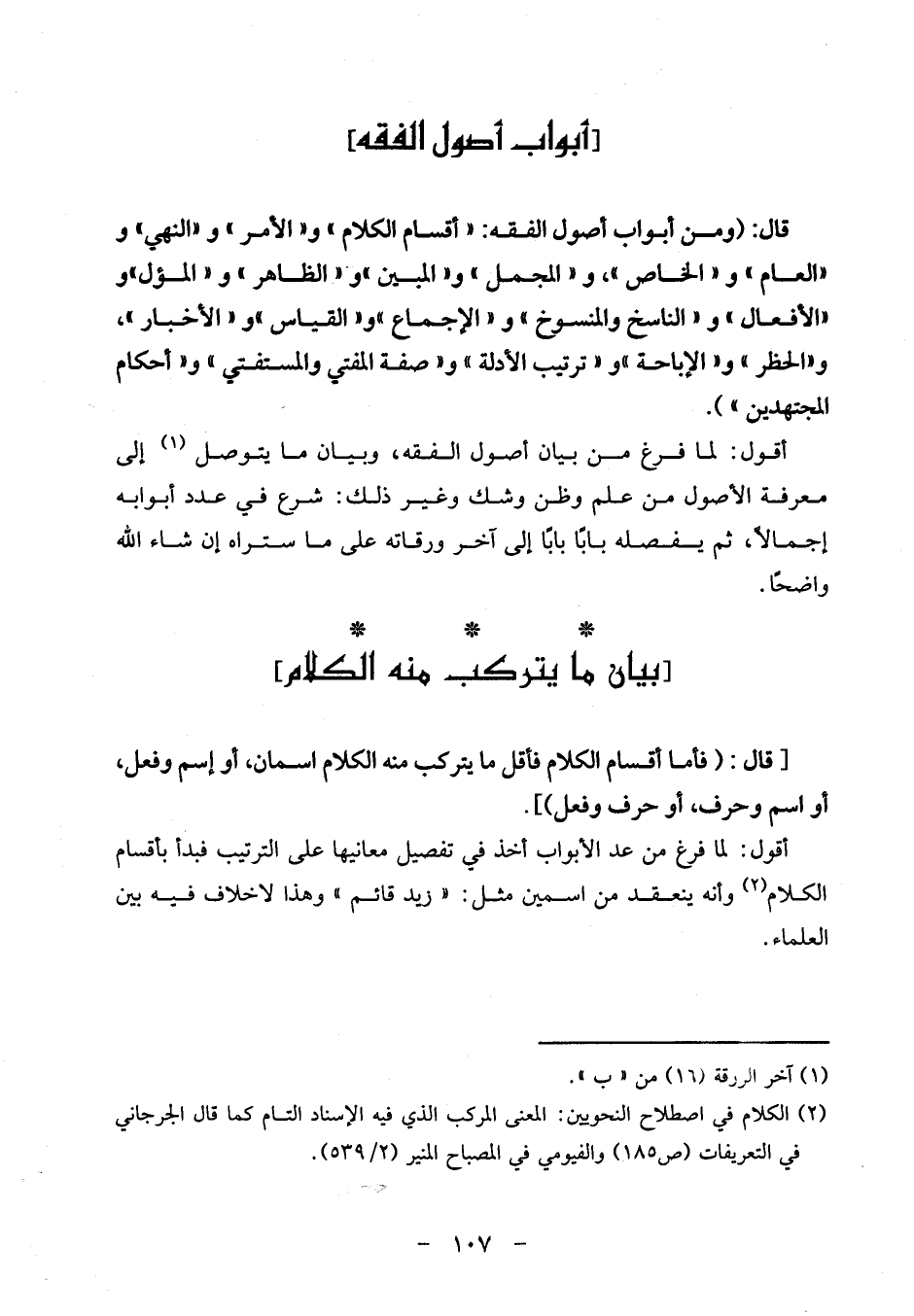 قَالَ: (وَمن أَبْوَاب أصُول الْفِقْه: " أَقسَام الْكَلَام " و " الْأَمر " و " النَّهْي " و " الْعَام " و " الْخَاص "، " والمجمل " و " الْمُبين " و " الظَّاهِر " و " المؤل " و " الْأَفْعَال " و " النَّاسِخ والمنسوخ " و " الْإِجْمَاع " و " الْقيَاس " و " الْأَخْبَار "، و " الْحَظْر " و " الْإِبَاحَة " و " تَرْتِيب الْأَدِلَّة " و " صفة الْمُفْتِي والمستفتي " و " أَحْكَام الْمُجْتَهدين ") .