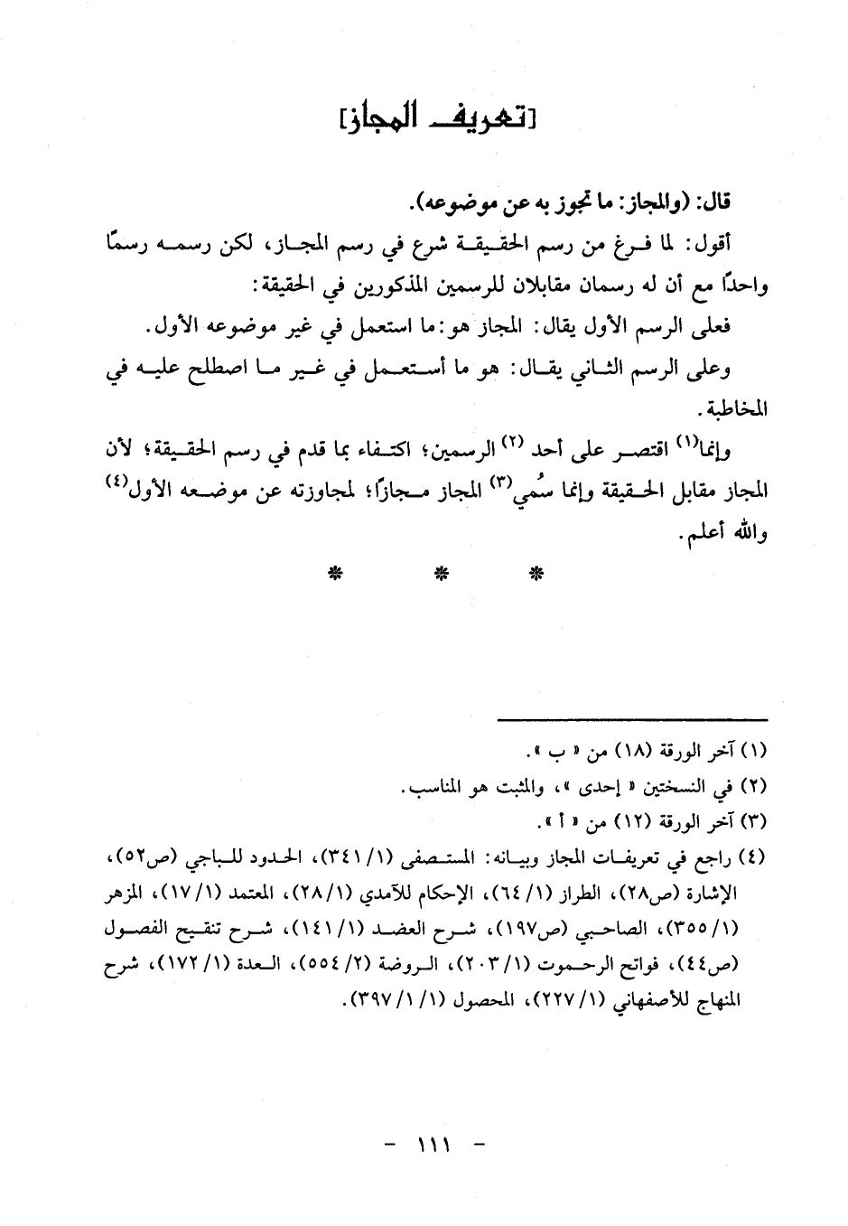 أَقُول: لما فرغ من رسم الْحَقِيقَة شرع فِي رسم الْمجَاز، لَكِن رسمه رسماً وَاحِدًا مَعَ أَن لَهُ رسمان مقابلان للرسمين الْمَذْكُورين فِي الْحَقِيقَة: