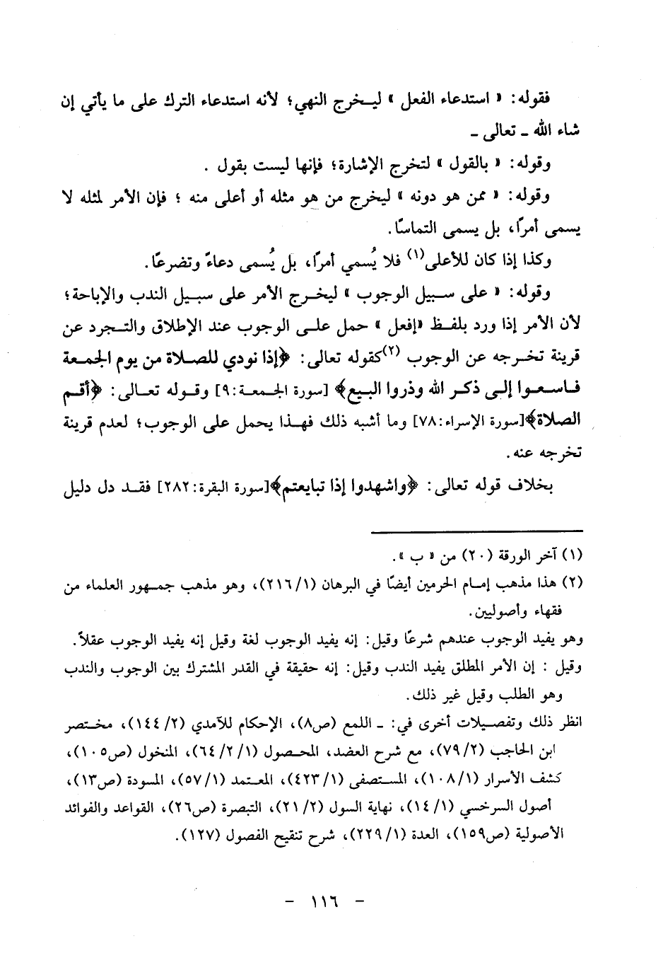 وَكَذَا إِذا كَانَ للأعلى فَلَا يُسَمِّي أمرا، بل يُسمى دُعَاء وتضرعاً. وَقَوله: " على سَبِيل الْوُجُوب " ليخرج الْأَمر على سَبِيل النّدب وَالْإِبَاحَة؛ لِأَن الْأَمر إِذا ورد بِلَفْظ " إفعل " حمل على الْوُجُوب عِنْد الْإِطْلَاق والتجرد عَن قرينه تخرجه عَن الْوُجُوب كَقَوْلِه تَعَالَى " {إِذا نُودي للصَّلَاة من يَوْم الْجُمُعَة فَاسْعَوْا إِلَى ذكر الله وذروا البيع} [سُورَة الْجُمُعَة: 9] وَقَوله تَعَالَى: {أقِم الصَّلَاة} [سُورَة الْإِسْرَاء: 78] وَمَا أشبه ذَلِك فَهَذَا يحمل على الْوُجُوب؛ لعدم قرينَة تخرجه عَنهُ.