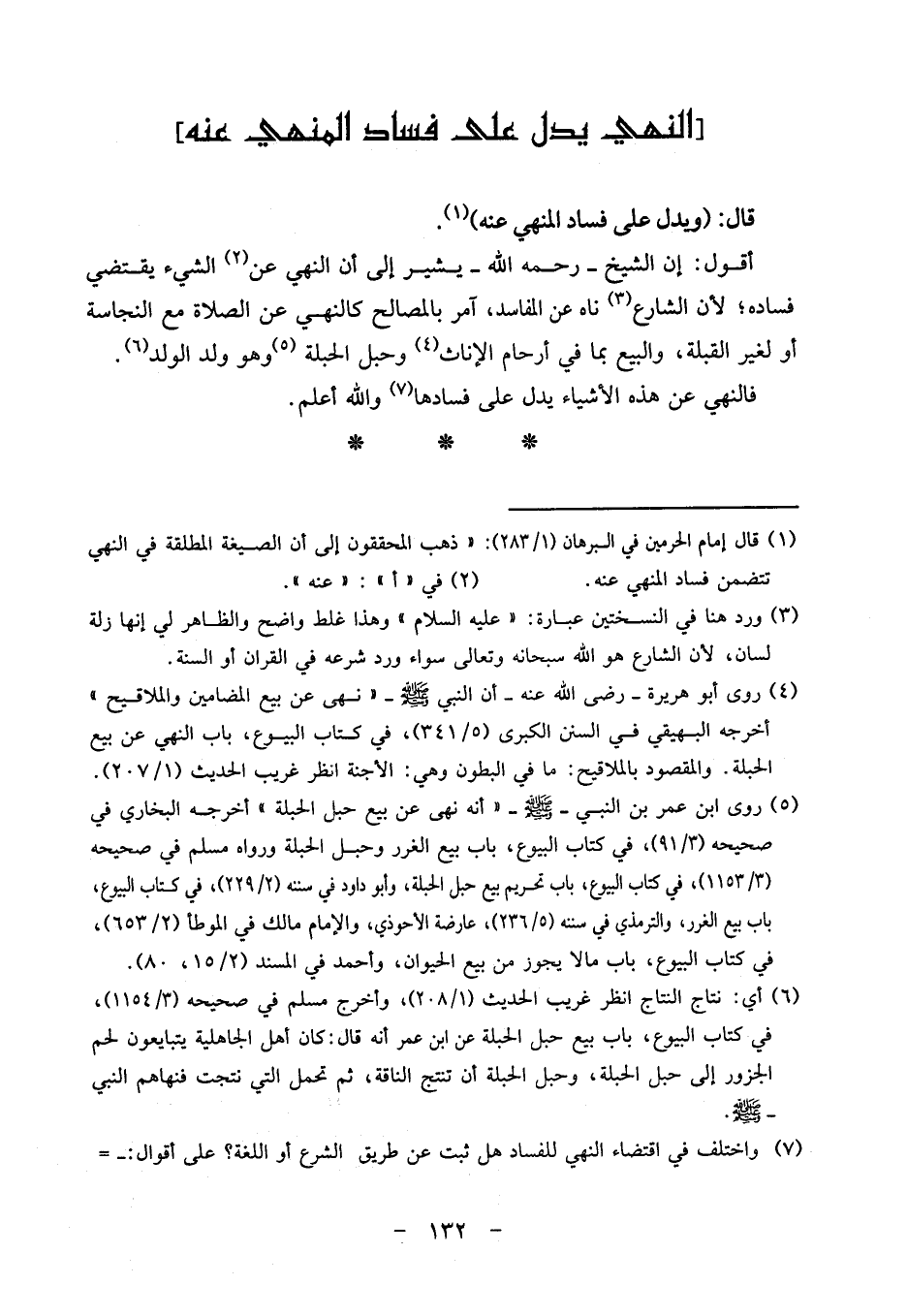 أَقُول: إِن الشَّيْخ - رَحمَه الله - يُشِير إِلَى أَن النَّهْي عَن الشَّيْء يَقْتَضِي فَسَاده؛ لِأَن الشَّارِع ناه عَن الْمَفَاسِد، آمُر بالمصالح كالنهي عَن الصَّلَاة مَعَ النَّجَاسَة أَو لغير الْقبْلَة، وَالْبيع بِمَا فِي أَرْحَام الْإِنَاث وحبل الحبلة وَهُوَ ولد الْوَلَد.