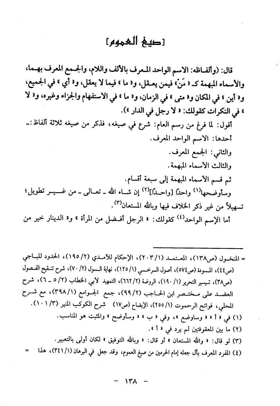 قَالَ: (وَأَلْفَاظه: الِاسْم الْوَاحِد الْمُعَرّف بِالْألف وَاللَّام، وَالْجمع الْمُعَرّف بهما، والأسماء المبهمة ك " من " فِيمَن يعقل، و " مَا " فِيمَا لَا يعقل، و " أَي " فِي الْجَمِيع، و " أَيْن " فِي الْمَكَان و " مَتى " فِي الزَّمَان " و " مَا " فِي الِاسْتِفْهَام وَالْجَزَاء وَغَيره، و " لَا " فِي النكرات كَقَوْلِك: " لَا رجل فِي الدَّار ") .
