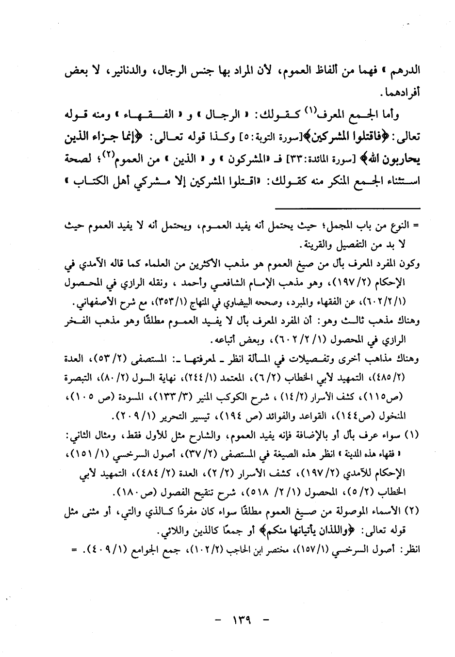 وَأما الْجمع الْمُعَرّف كَقَوْلِك: " الرِّجَال " و " وَالْفُقَهَاء " وَمِنْه قَوْله تَعَالَى: {فَاقْتُلُوا الْمُشْركين} [سُورَة التَّوْبَة: 5] وَكَذَا قَوْله تَعَالَى: {إِنَّمَا جَزَاء الَّذين يُحَاربُونَ الله} [سُورَة الْمَائِدَة: 33] ف " الْمُشْركُونَ " و " الَّذين " من الْعُمُوم؛ لصِحَّة اسْتثِْنَاء الْجمع الْمُنكر مِنْهُ كَقَوْلِك: " اقْتُلُوا الْمُشْركين إِلَّا مُشْركي أهل الْكتاب "