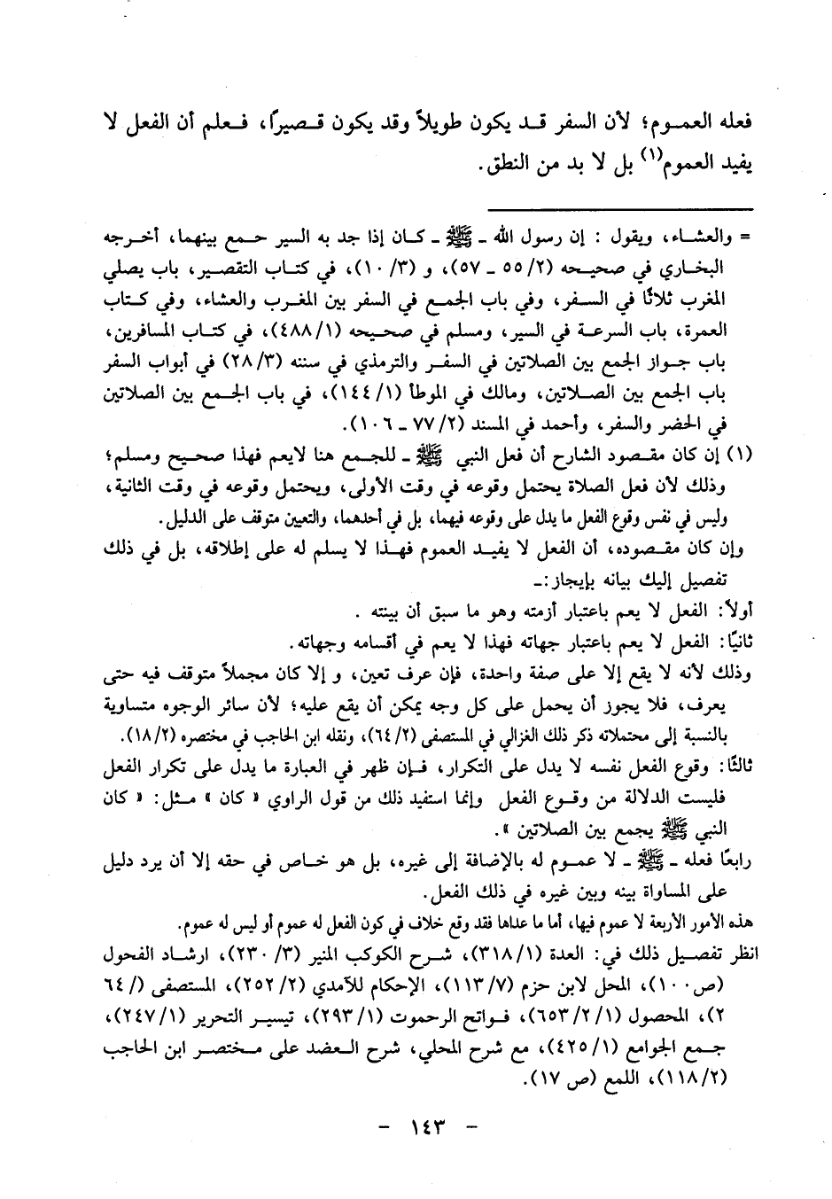 فعله الْعُمُوم؛ لِأَن السّفر قد يكون طَويلا وَقد يكون قَصِيرا، فَعلم أَن الْفِعْل لَا يُفِيد الْعُمُوم بل لابد من النُّطْق.