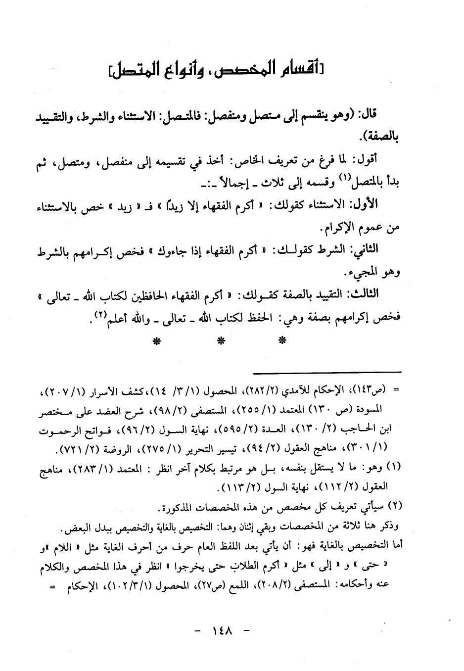 قَالَ: (وَهُوَ يَنْقَسِم إِلَى مُتَّصِل ومنفصل: فالمتصل: الِاسْتِثْنَاء وَالشّرط، وَالتَّقْيِيد بِالصّفةِ) .