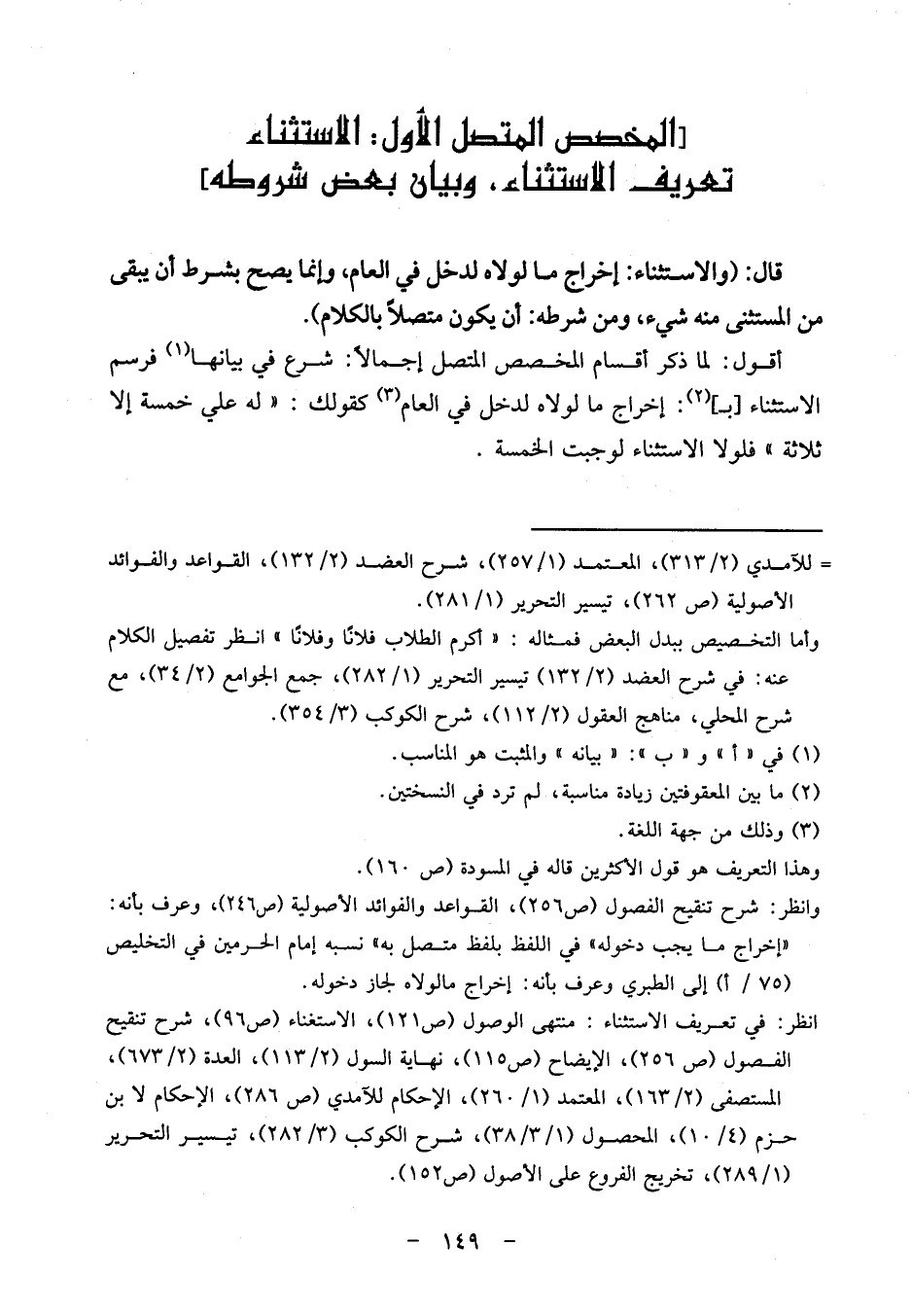 أَقُول: لما ذكر أَقسَام الْمُخَصّص الْمُتَّصِل إِجْمَالا: شرع فِي بَيَانهَا فرسم الِاسْتِثْنَاء [ب] : إِخْرَاج مَا لولاه لدخل فِي الْعَام كَقَوْلِك: " لَهُ عَليّ خَمْسَة إِلَّا ثَلَاثَة " فلولا الِاسْتِثْنَاء لَوَجَبَتْ الْخَمْسَة.