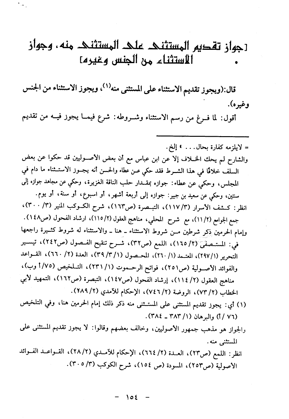 قَالَ: (وَيجوز تَقْدِيم الِاسْتِثْنَاء على الْمُسْتَثْنى مِنْهُ، وَيجوز الِاسْتِثْنَاء من الْجِنْس وَغَيره) .
