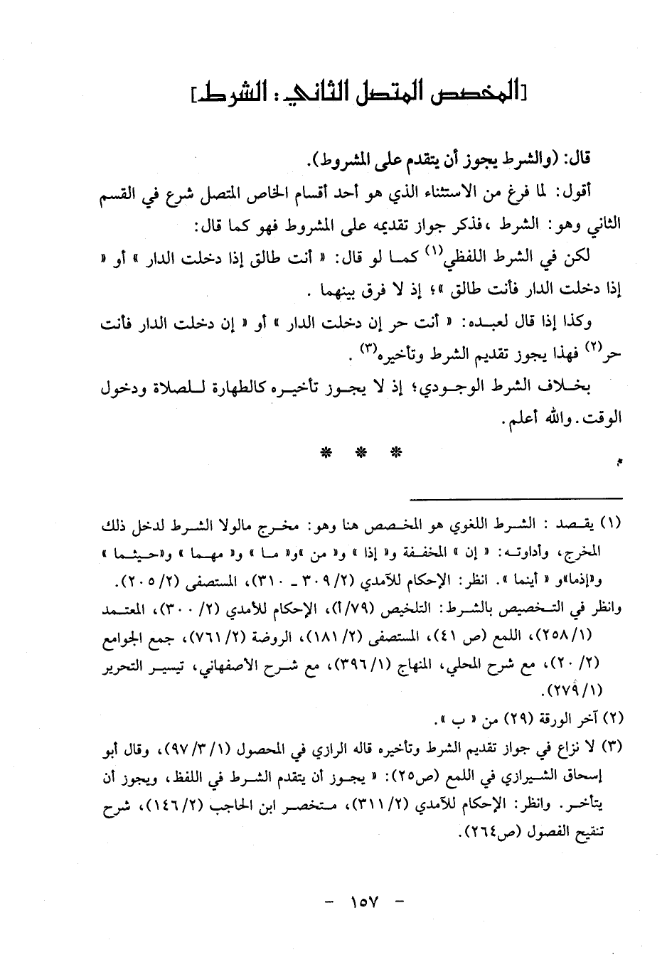 أَقُول: لما فرغ من الِاسْتِثْنَاء الَّذِي هُوَ أحد أَقسَام الْخَاص الْمُتَّصِل شرع فِي الْقسم الثَّانِي وَهُوَ: الشَّرْط، فَذكر جَوَاز تَقْدِيمه على الْمَشْرُوط فَهُوَ كَمَا قَالَ: