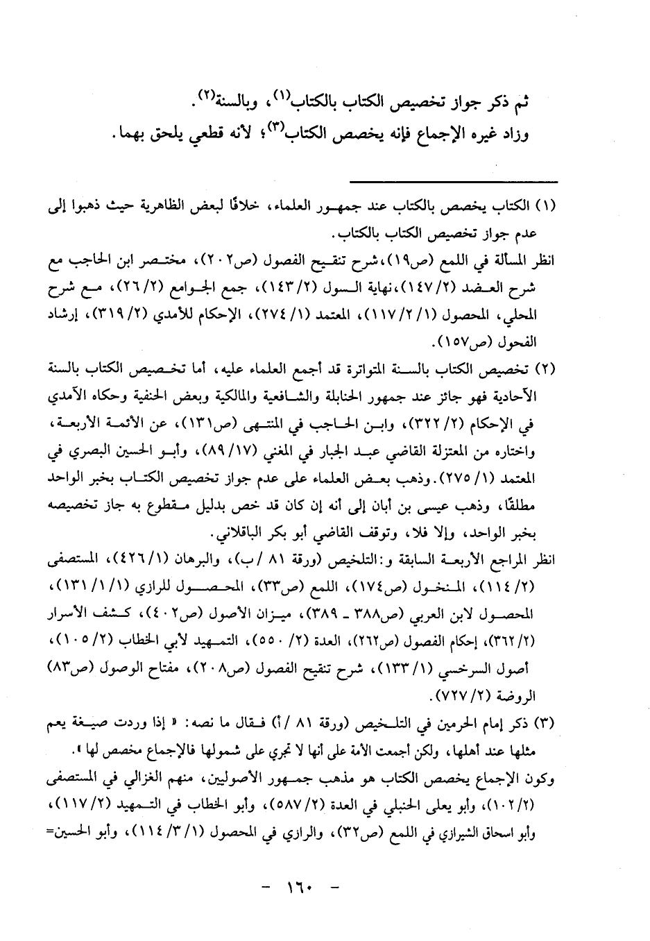 ثمَّ ذكر جَوَاز تَخْصِيص الْكتاب بِالْكتاب، وبالسنة.