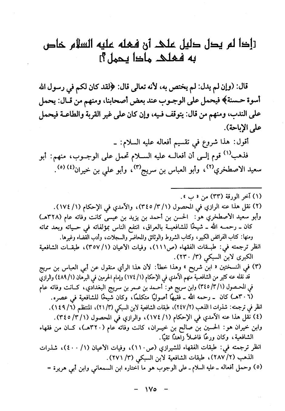 فَذهب قوم إِلَى أَن أَفعاله عَلَيْهِ السَّلَام تحمل على الْوُجُوب، مِنْهُم: أَبُو سعيد الاصطخري، وَأَبُو الْعَبَّاس بن سُرَيج، وَأَبُو عَليّ بن خيران.
