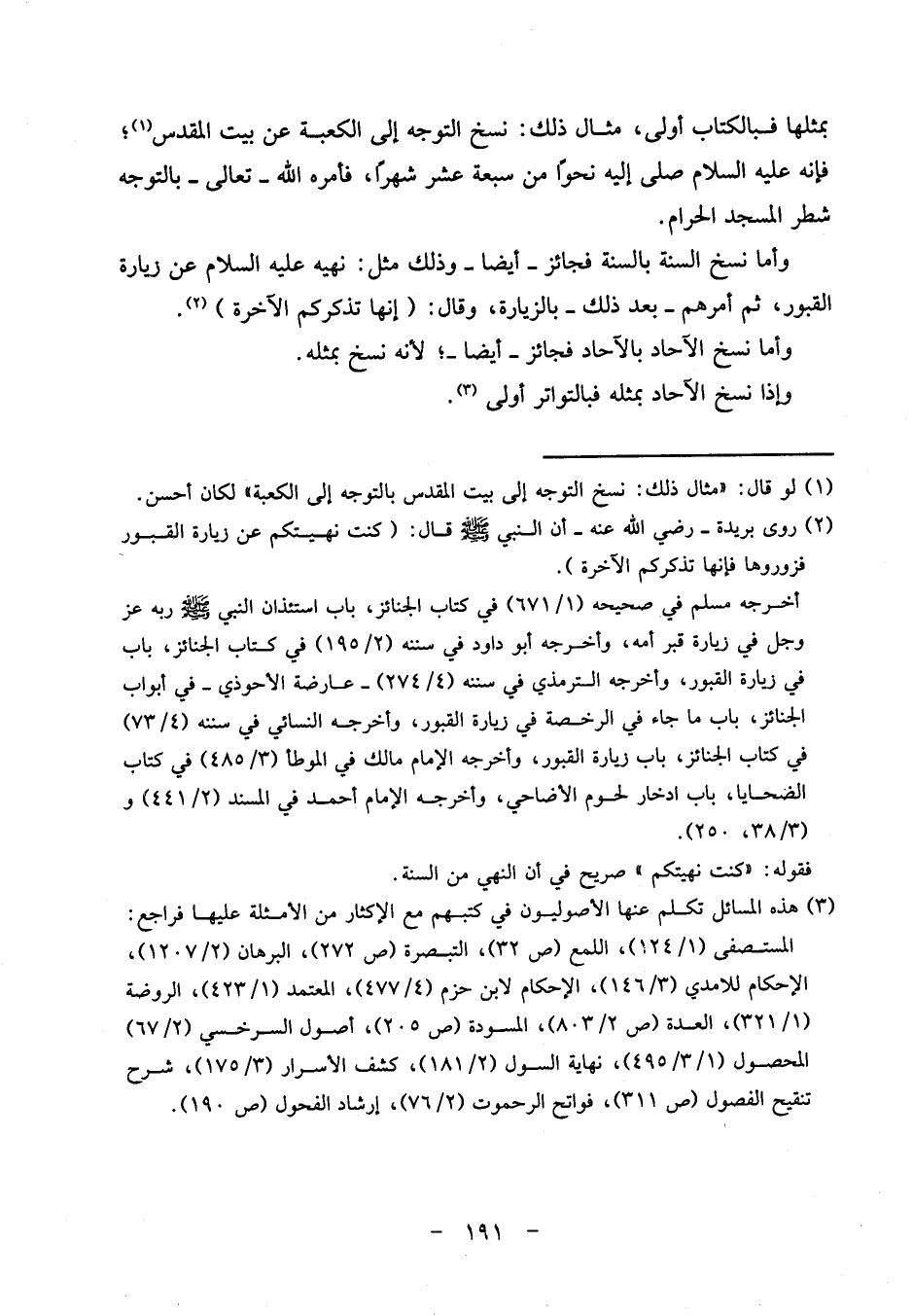 وَأما نسخ السّنة بِالسنةِ فَجَائِز - أَيْضا - وَذَلِكَ مثل: نَهْيه عَلَيْهِ السَّلَام عَن زِيَارَة الْقُبُور، ثمَّ أَمرهم - بعد ذَلِك - بالزيارة، وَقَالَ: (إِنَّهَا تذكركم الْآخِرَة) .