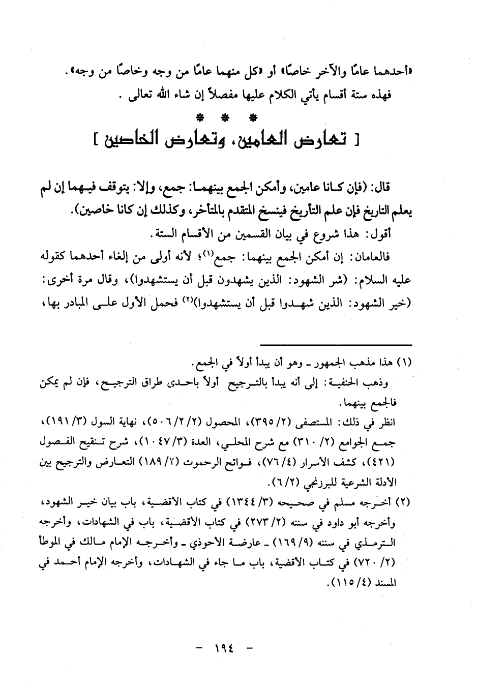 فالعامان: إِن أمكن الْجمع بَينهمَا: جمع؛ لِأَنَّهُ أولى من إِلْغَاء أَحدهمَا كَقَوْلِه عَلَيْهِ السَّلَام: (شَرّ الشُّهُود: الَّذين يشْهدُونَ قبل أَن يستشهدوا) ، وَقَالَ مرّة أُخْرَى: (خير الشُّهُود: الَّذين شهدُوا قبل أَن يستشهدوا) فَحمل الأول على المبادر بهَا،