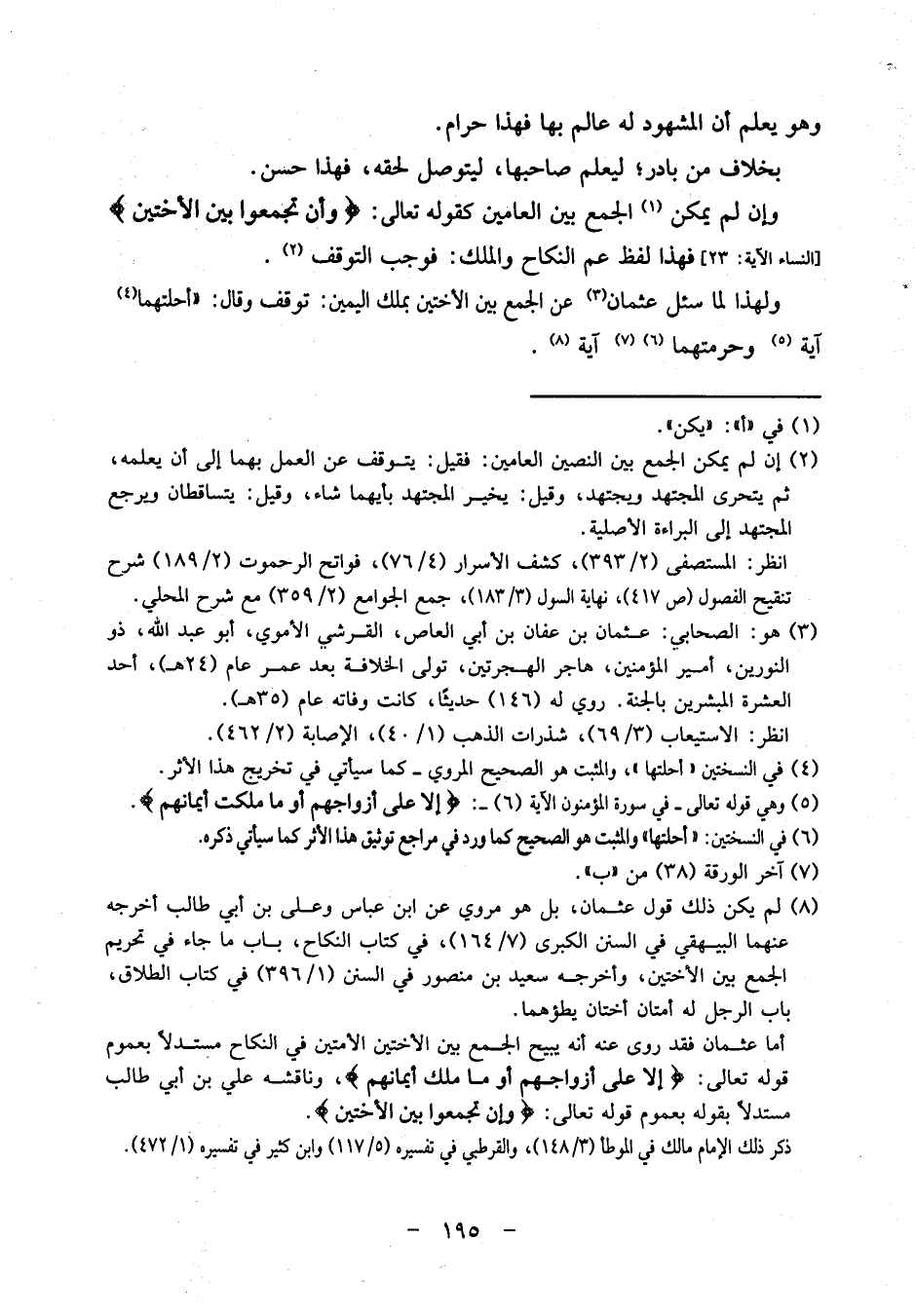 وَلِهَذَا لما سُئِلَ عُثْمَان عَن الْجمع بَين الْأُخْتَيْنِ بِملك الْيمن: توقف وَقَالَ: " أَحَلَّتْهُمَا آيَة وحرمتهما آيَة.