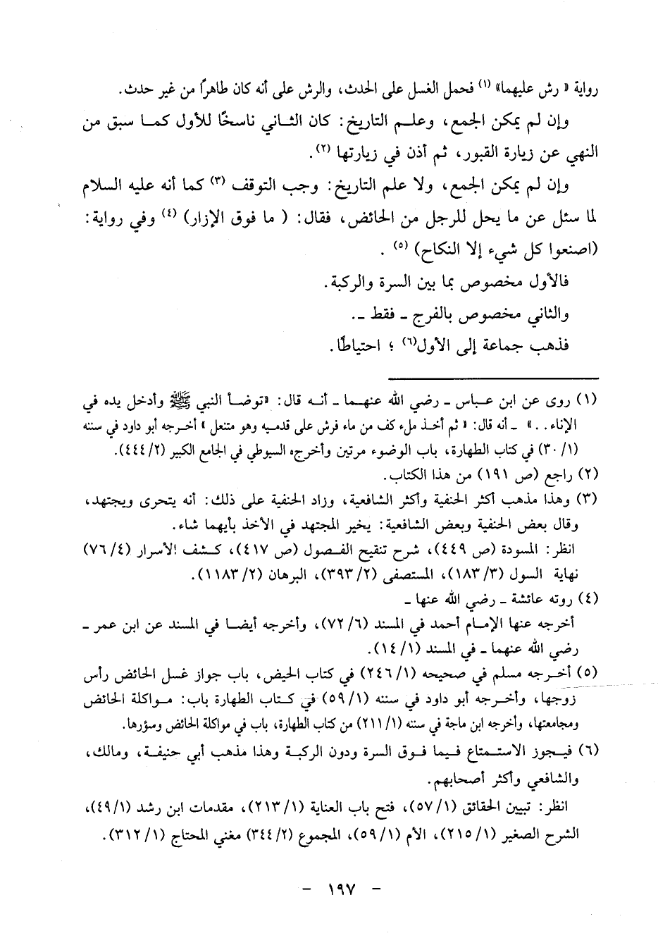 وَإِن لم يُمكن الْجمع، وَلَا علم التَّارِيخ: وَجب التَّوَقُّف كَمَا انه عَلَيْهِ السَّلَام لما سُئِلَ عَن مَا يحل للرجل من الْحَائِض، فَقَالَ: (مَا فَوق الْإِزَار) وَفِي رِوَايَة: (اصنعوا كل شَيْء إِلَّا النِّكَاح) .