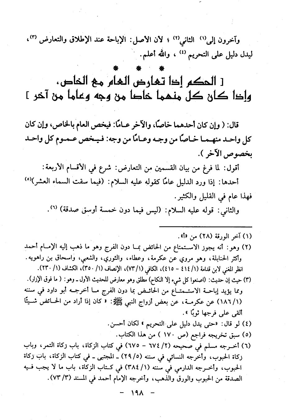 قَالَ: (وَإِن كَانَ أَحدهمَا خَاصّا، وَالْآخر عَاما: فيخص الْعَام بالخاص، وَإِن كَانَ كل وَاحِد مِنْهُمَا خَاصّا من وَجه وعاماً من وَجه: فيخص عُمُوم كل وَاحِد بِخُصُوص الآخر) .