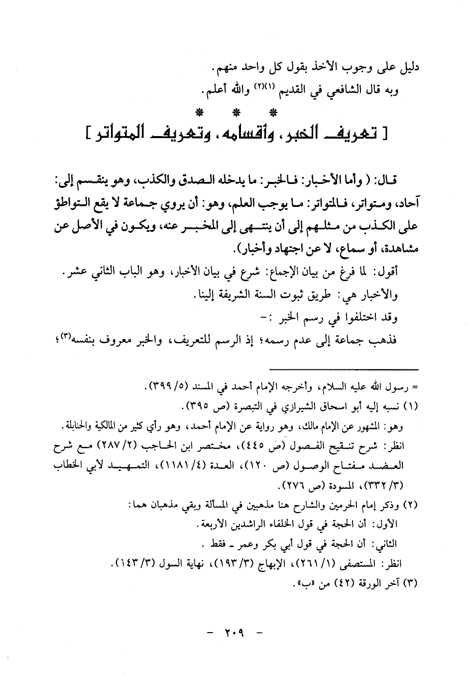 آحَاد، ومتواتر، فالمتواتر: مَا يُوجب الْعلم، وَهُوَ: أَن يروي جمَاعَة لَا يَقع التواطؤ على الْكَذِب من مثلهم إِلَى أَن يَنْتَهِي إِلَى الْمخبر عَنهُ، وَيكون فِي الأَصْل عَن مُشَاهدَة، أَو سَماع، لَا عَن اجْتِهَاد وأخبار) .
